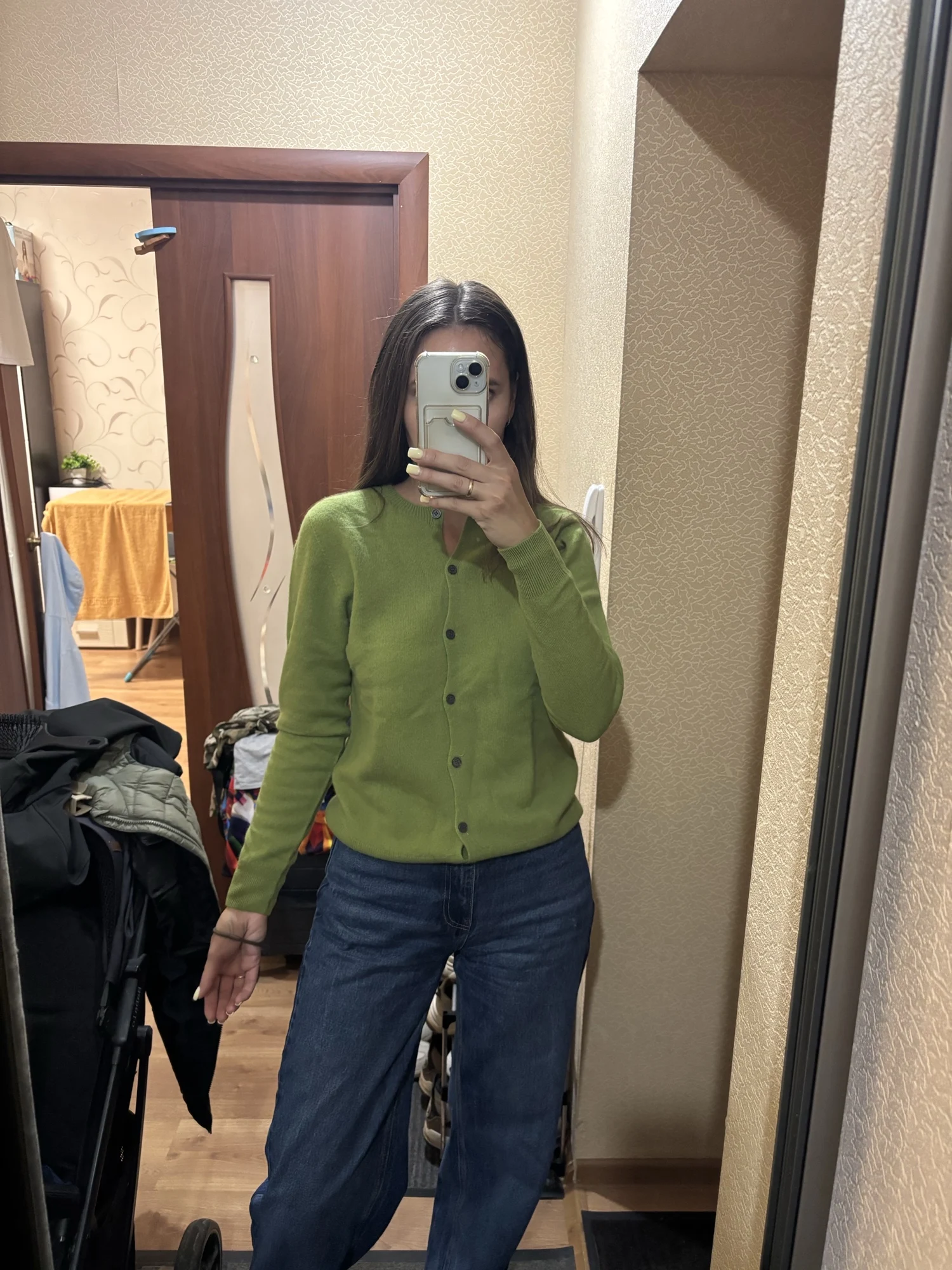 Delivered in 14 days. I ordered XL for size 44-46 and height 170, it fit perfectly. It does contain wool, but it's not suitable for wearing on bare skin. There is a smell, a mixture of mustiness and fur, I hope it will disappear after washing.