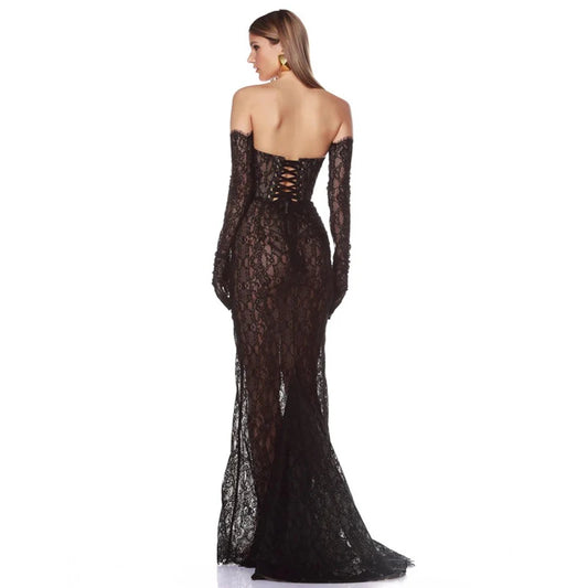 Strapless Lace Black Tie Gown Dress with Matching Lace Gloves