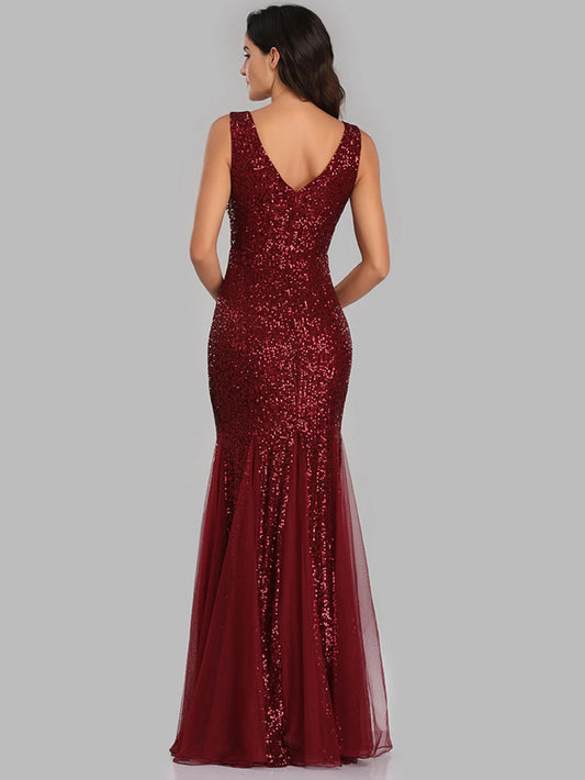 Sleeveless V Neckline Sequin Evening Dress