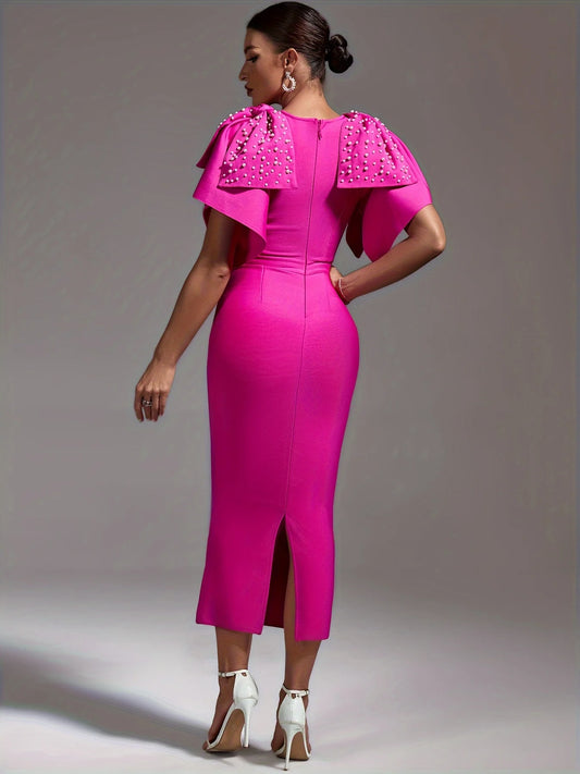 Crew Neckline Maxi Fuchsia Butterfly Sleeves Pearl Details Dress
