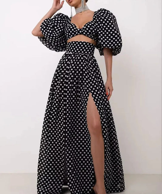 Polka Dots Cropped Top and Side Slits High Waist Skirt Set