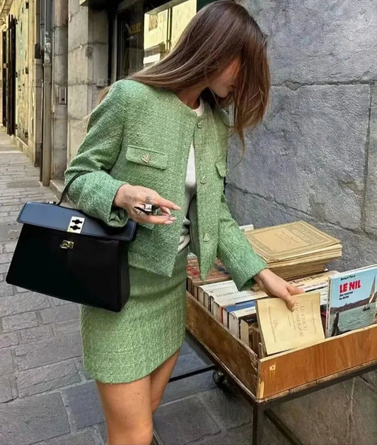 Women’s Winter-Autumn Tweed Mini Suit – Single-Breasted Jacket & Skirt