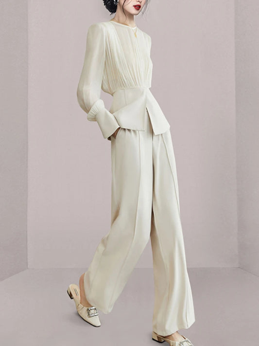 Long Sleeve Top with Wide Leg Trousers Semi-Formal Ivory Suit