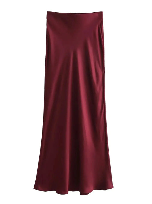 Flowing Satin Midi High Waist Flared Hem Skirt