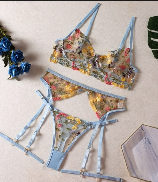 Floral Embroidery Lace 3-Piece Lingerie Set