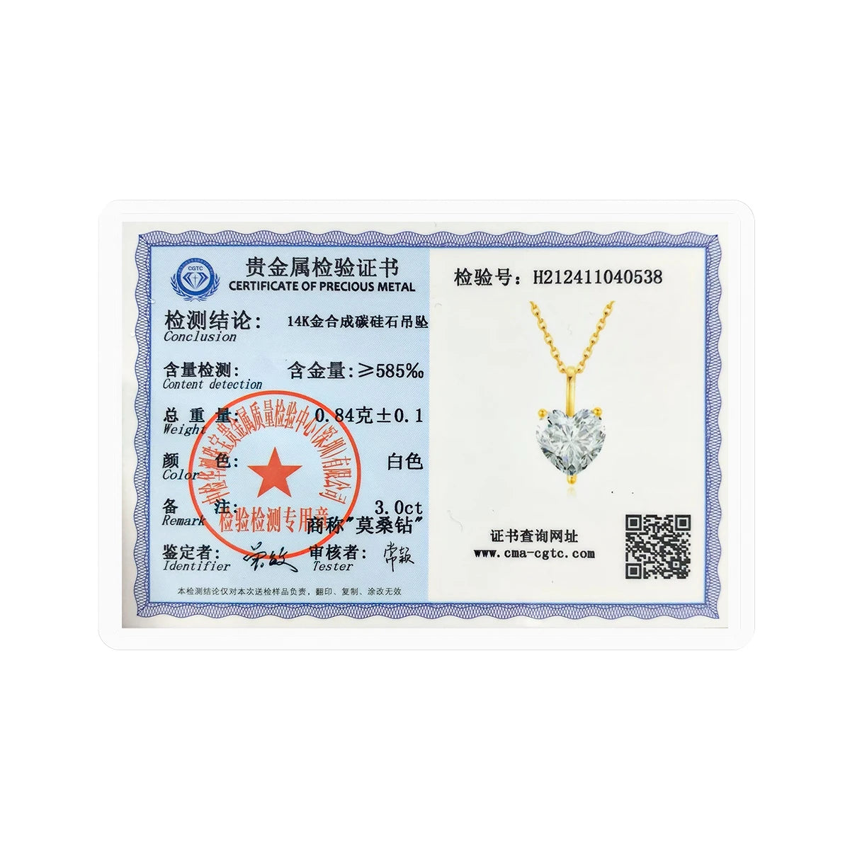 The pendant is paired with a solid 925 sterling silver chain, adjustable from 40cm to 45cm (15.7–17.7 inches), allowing for a perfect fit whether worn alone or layered with other pieces. Every necklace comes complete with both a 14K gold authenticity certificate and a GRA moissanite certificate, assuring quality, craftsmanship, and peace of mind.