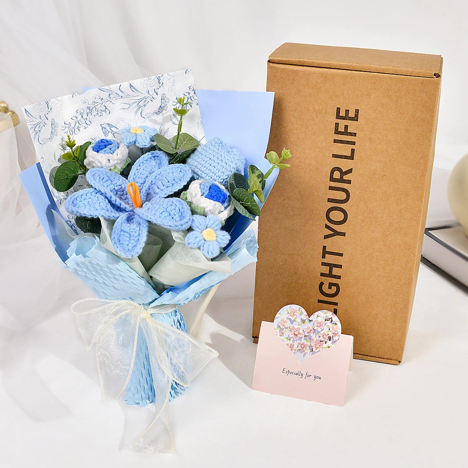 Unlike fresh flowers, this bouquet requires no water, no care, and never wilts, making it a meaningful keepsake she can treasure for years. The delicate texture and artisanal craftsmanship give the bouquet a warm, heartfelt presence, perfect for expressing love in a thoughtful and intentional way. Whether displayed on a desk, bedside table, or shelf, it adds a gentle romantic charm to any space.
