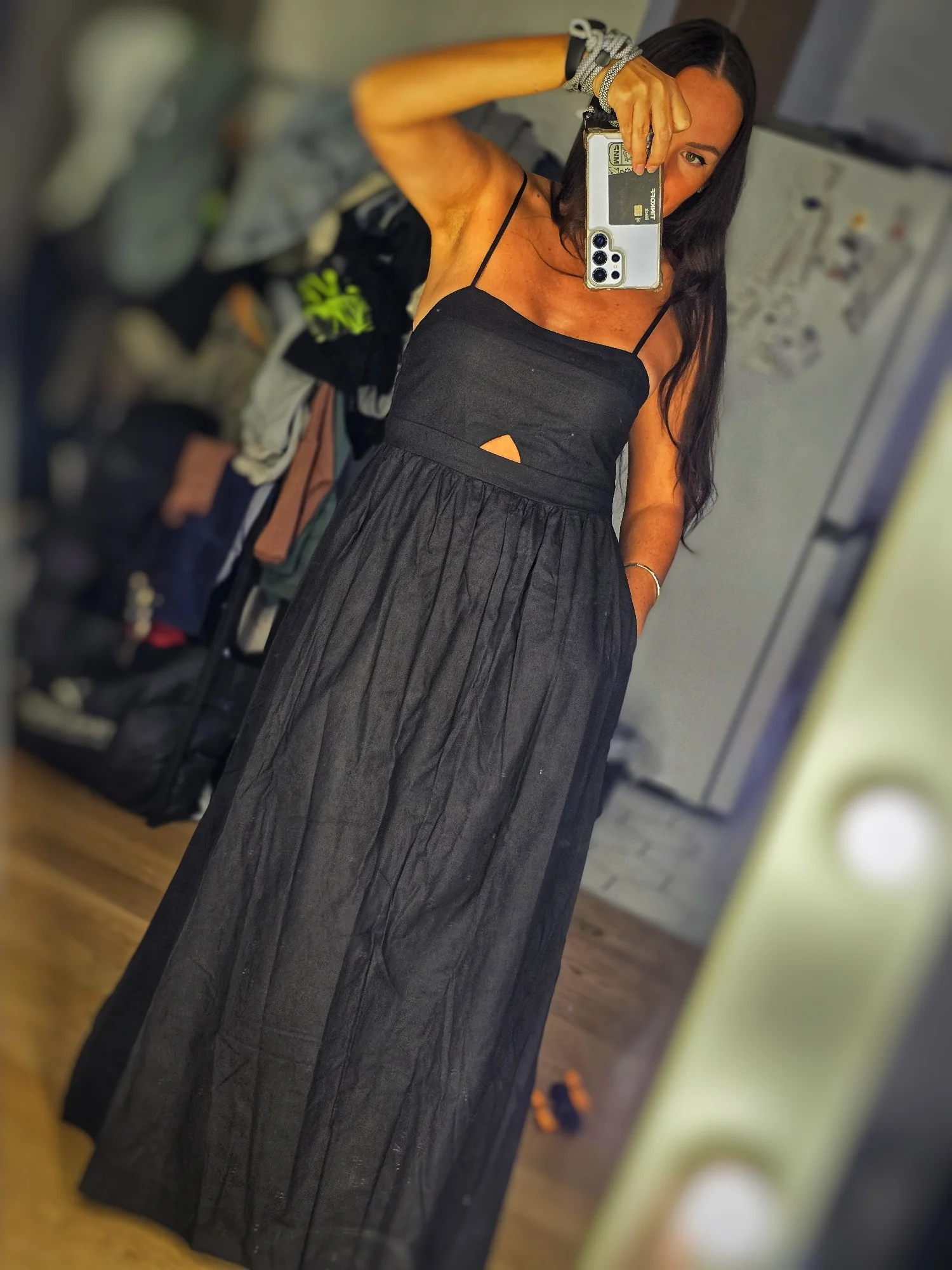 A-Line Cotton Black Cutout Maxi Dress With Pockets