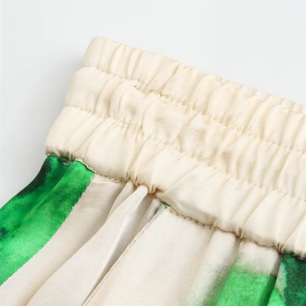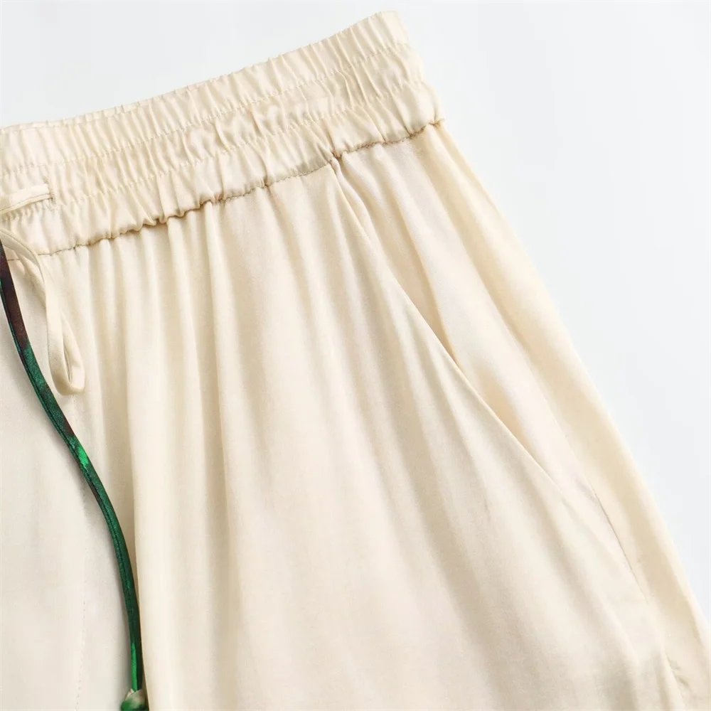 • Trousers: High-waisted with a comfortable elastic waistband and wide-leg design for a flattering silhouette.