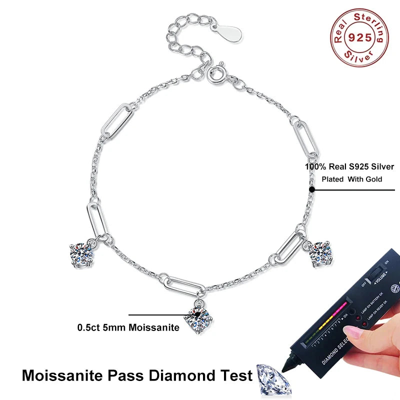 Give the gift of timeless sparkle with this 1.5CT Moissanite 3-Charms Bracelet — a luxurious yet meaningful piece designed for birthdays, anniversaries, bridesmaids, or any unforgettable occasion. Featuring three brilliant 0.5CT D-color moissanite stones (totaling 1.5CT), this bracelet is crafted in solid 925 sterling silver and plated with 18K gold for a warm, elegant finish.