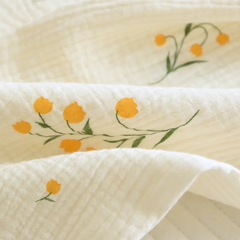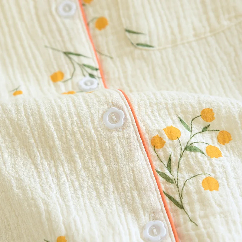 After washing, our pure cotton fabric becomes even softer, enhancing the cozy feel of this ensemble. To maintain its quality, we recommend washing by hand and avoiding hot or warm water, as gauze and crepe have shrinkage properties.