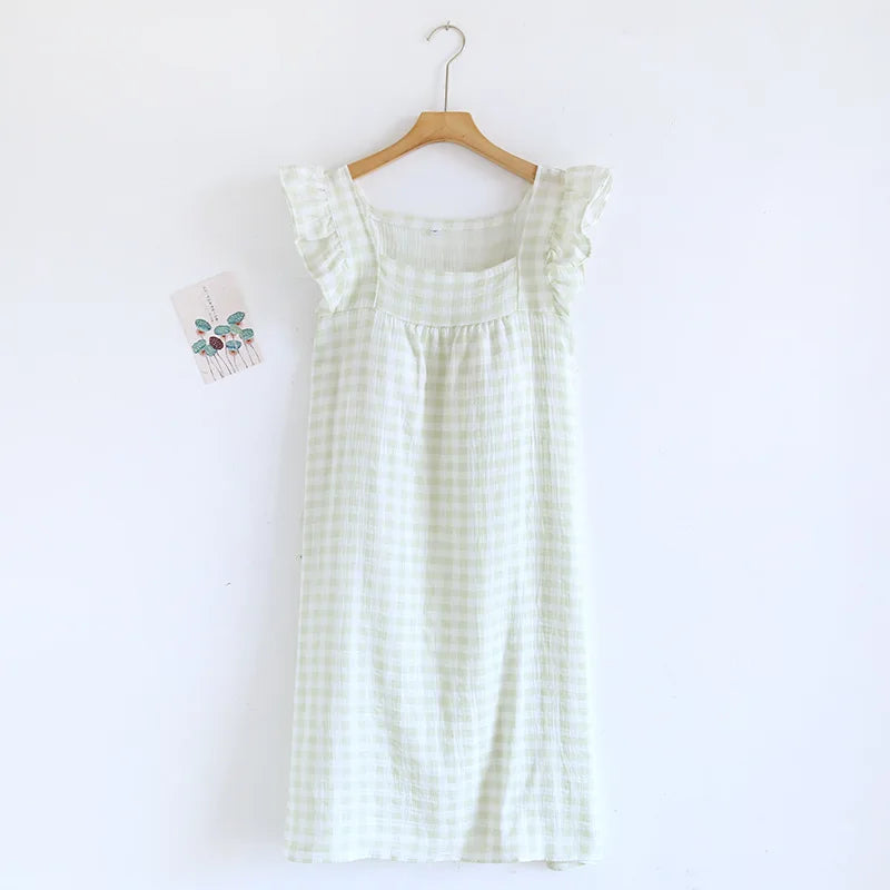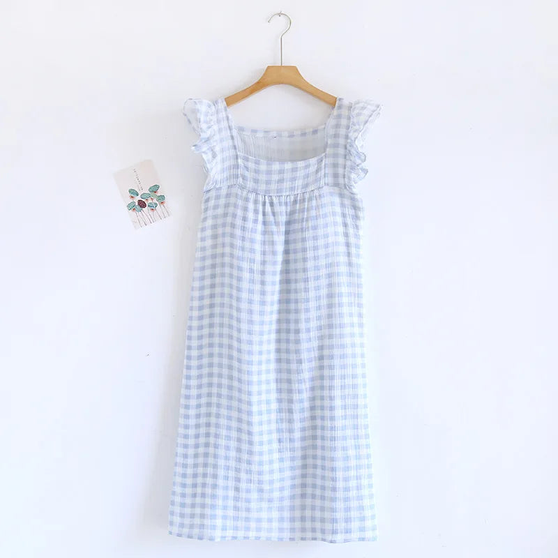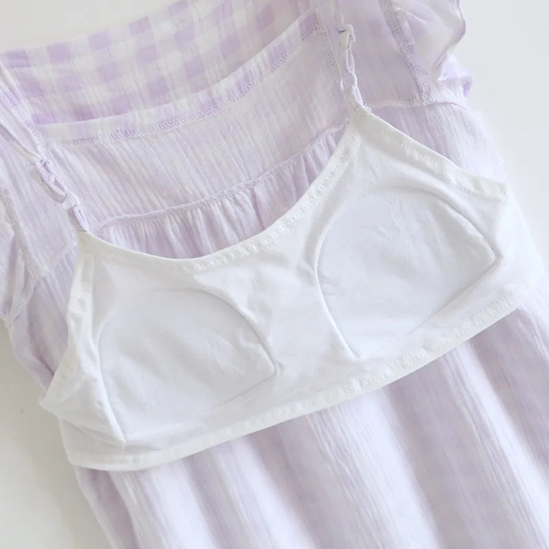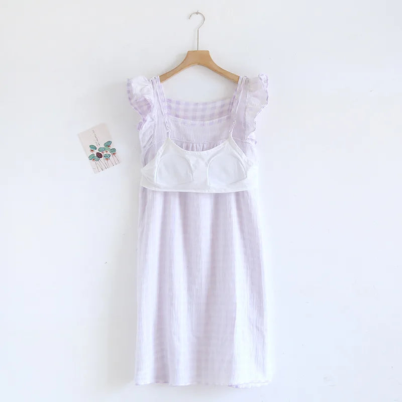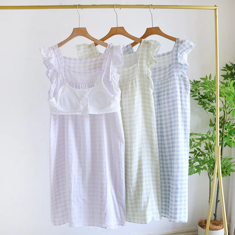 100% Pure Cotton Home Dress Plaid Nightgown with Built-in Bra