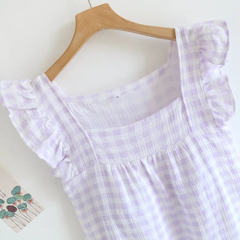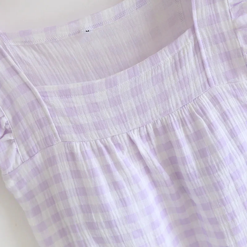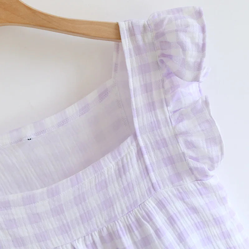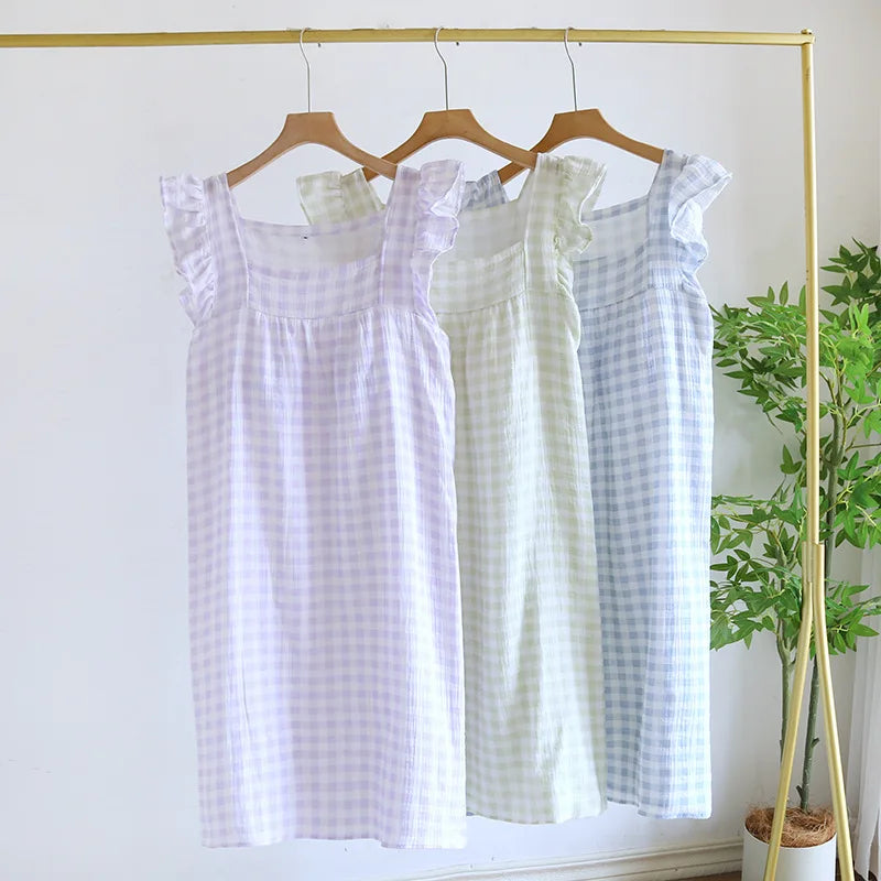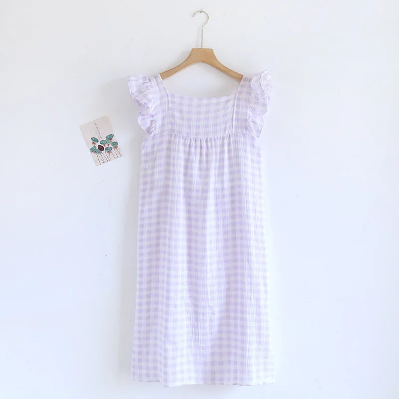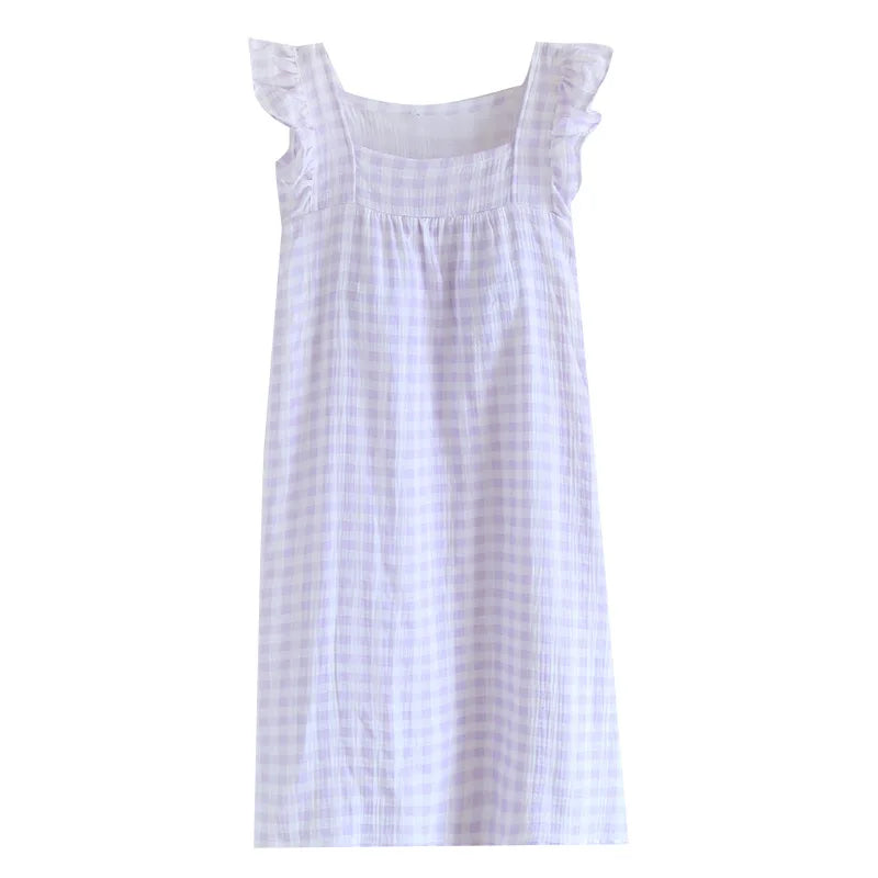 Experience the ultimate in comfort and style with our 100% Pure Cotton Home Dress Plaid Nightgown. This classic piece is designed with skin-friendly, breathable, and sweat-absorbent cotton fabric, ensuring a soft and gentle touch against your skin. Available in soothing shades of lavender, light green, and baby blue, this nightgown is perfect for peaceful nights and lazy mornings.