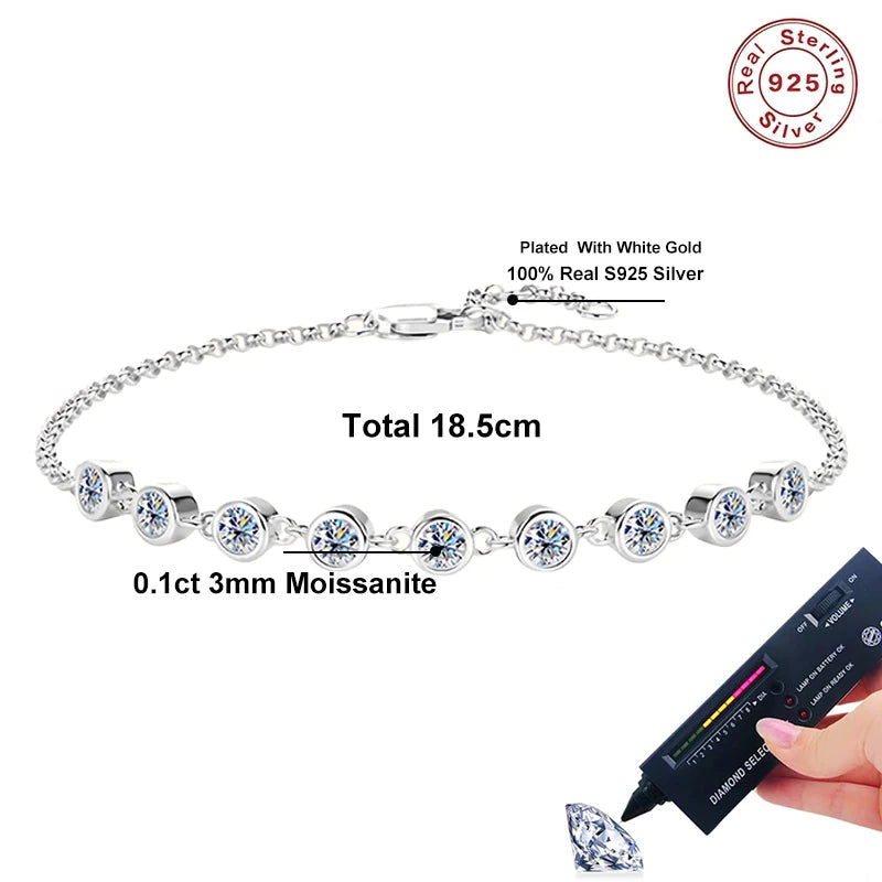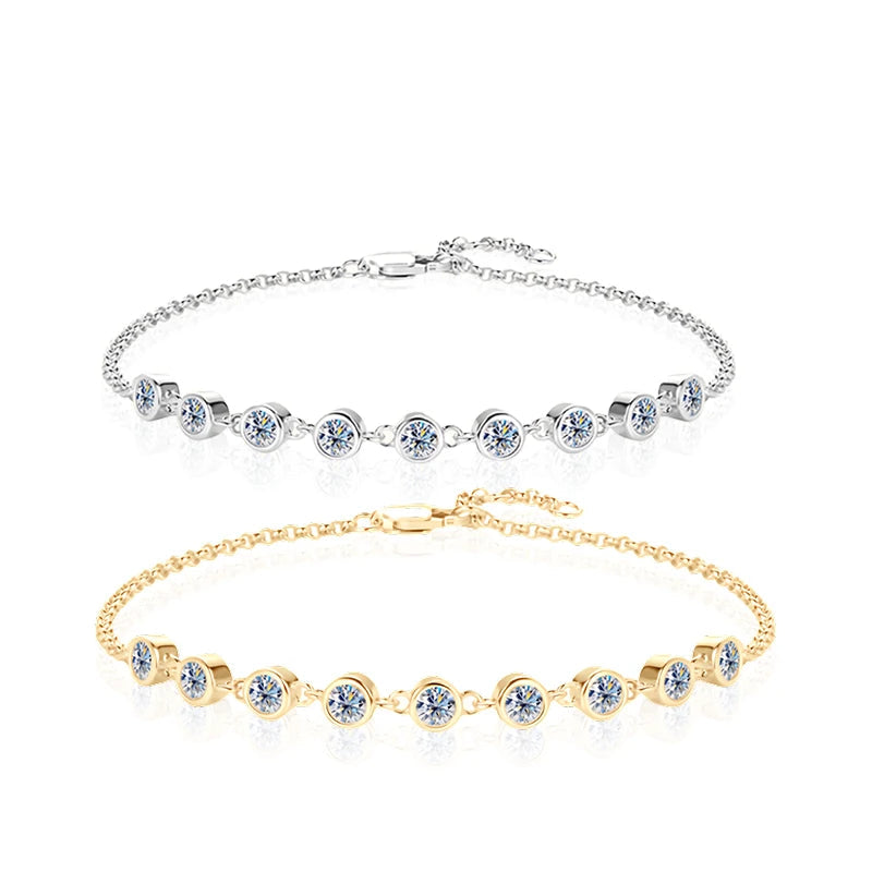 Gracefully delicate and undeniably radiant, this Moissanite Charm Bracelet is the perfect blend of timeless elegance and modern luxury. Crafted from 100% 925 sterling silver and plated in 18K gold, it features nine brilliant 3mm moissanite stones, each with 0.1ct D-color VVS1 clarity — delivering stunning fire and sparkle that rivals real diamonds.