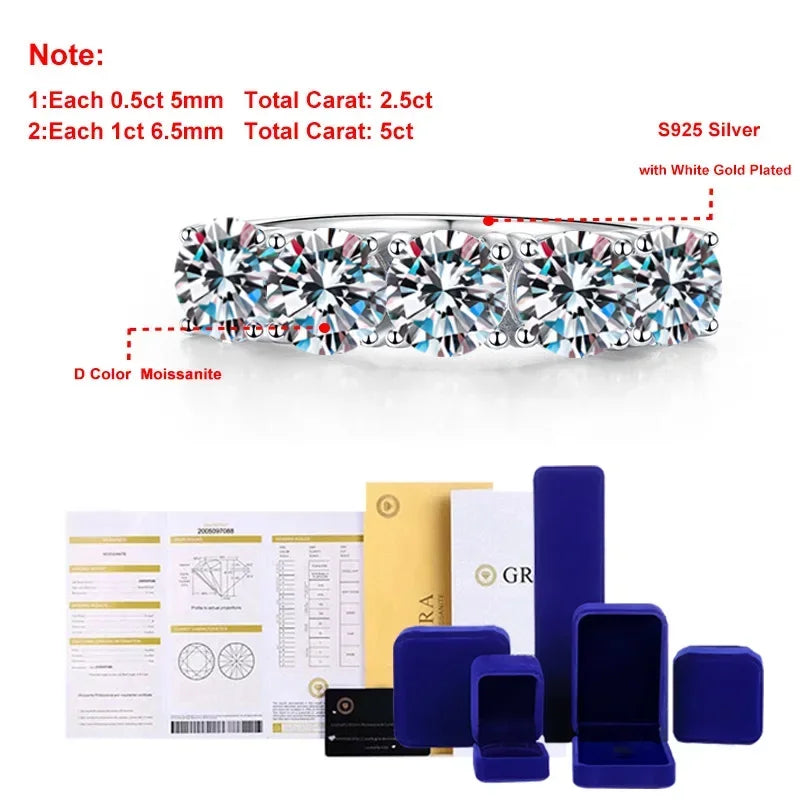 - 0.5ct (5mm): Five exquisite Moissanite stones, totaling 2.5 CT.