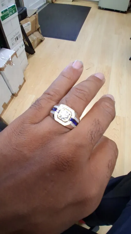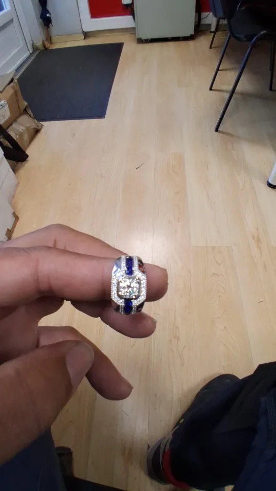 The blue stones in the middle i think is lab royal blue sapphires (it acts like sapphire on the diamond selector ii tester).