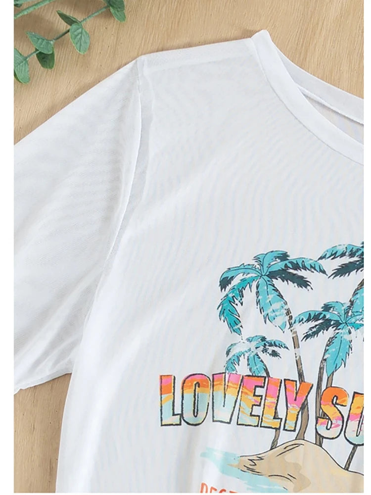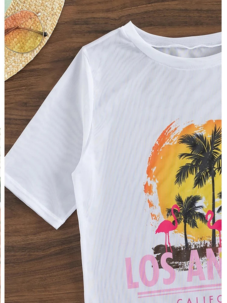- Sheer T-Shirt: A lightweight, sheer t-shirt with a vibrant beach print, adding an extra layer of style and sun protection.