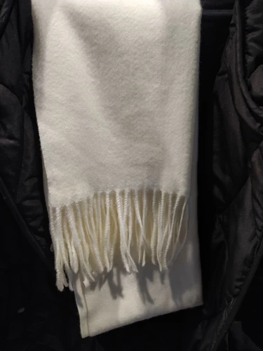 Milk-colored scarf, soft, even coloring, no defects. Of course, it's synthetic, but it will be enough for our winters. The width is just right to wear under outerwear. Delivery is very fast.