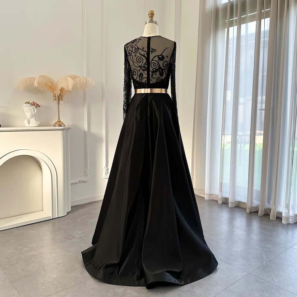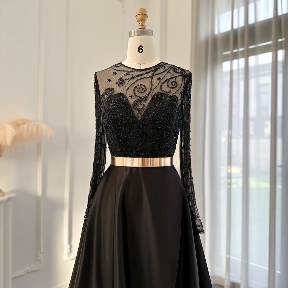 Black Tie Satin Long Sleeves Lace Details Black Evening Dress