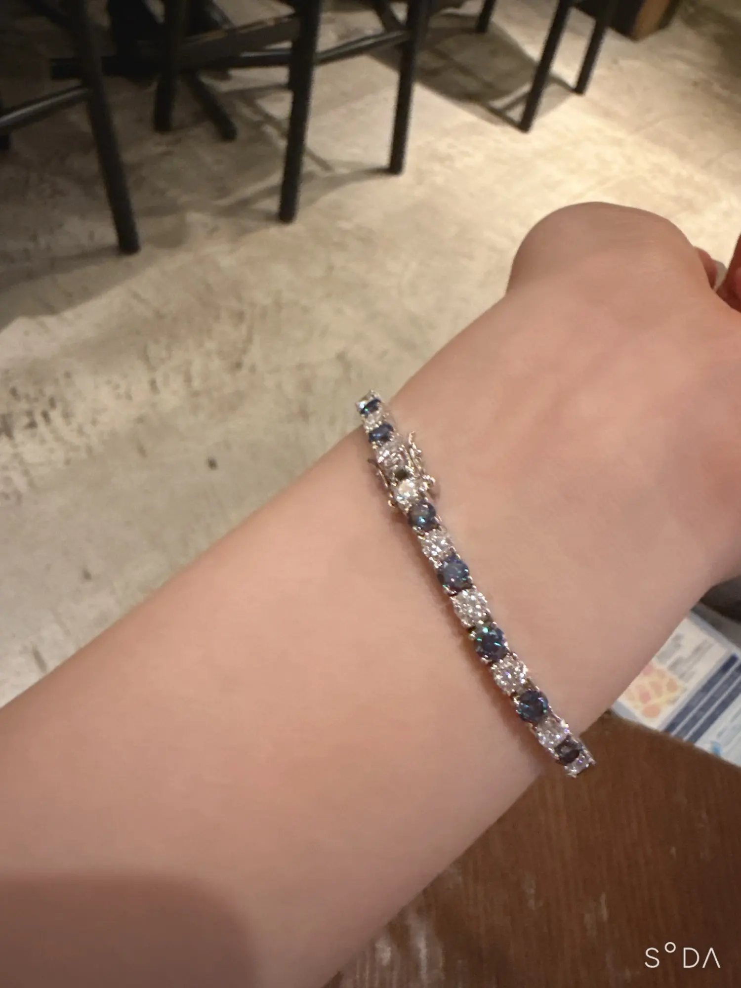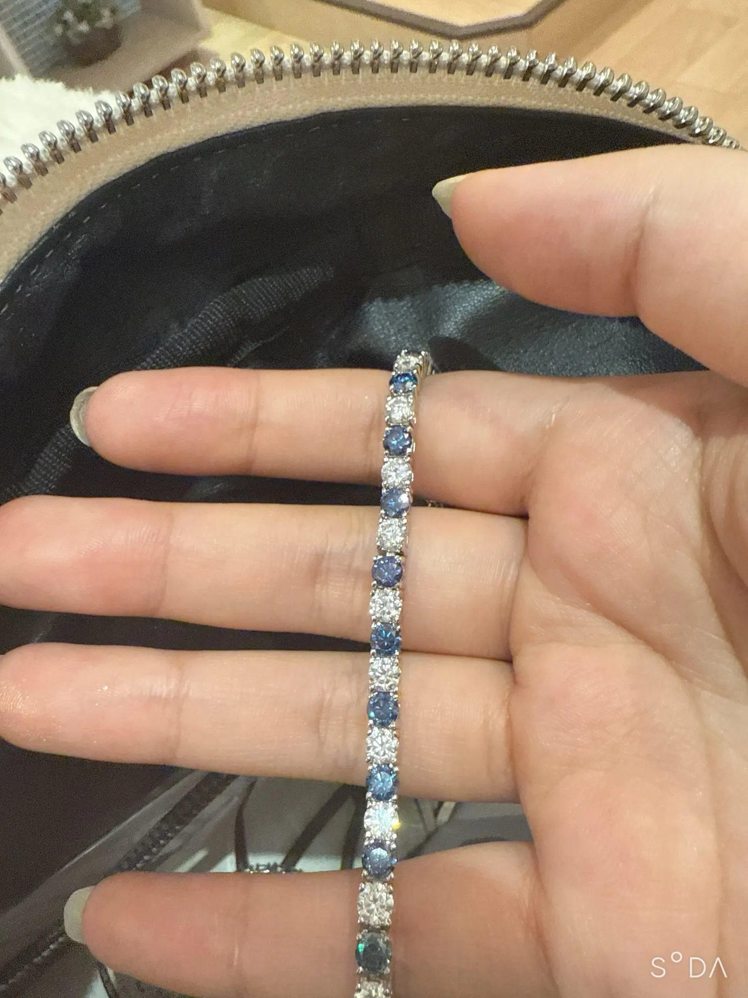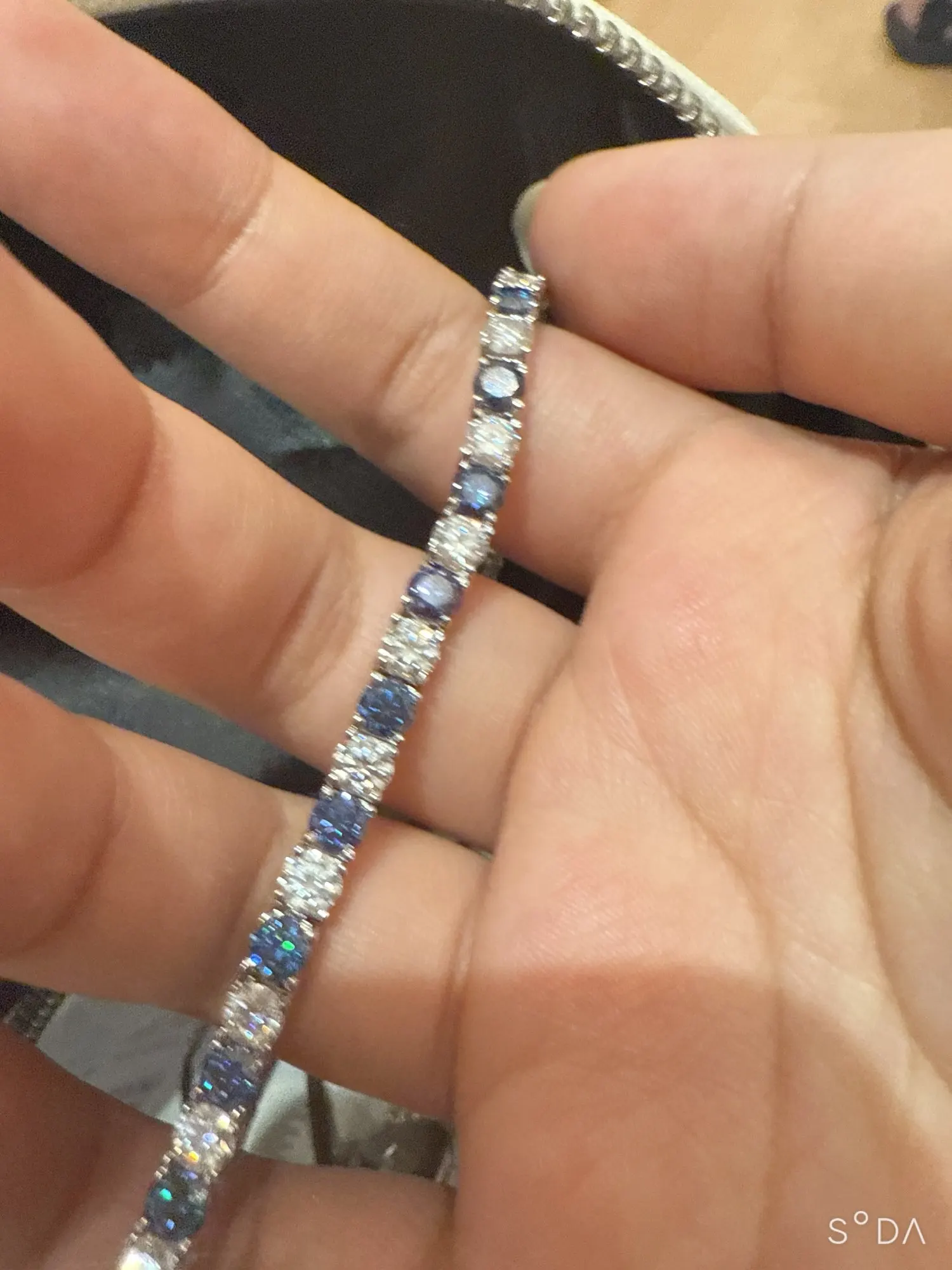 The bracelet are as advertised, the gems are very sparkly. If you want a tight fit, measure your wrist and just add an cm. Definitely will buy another from seller in a different color.