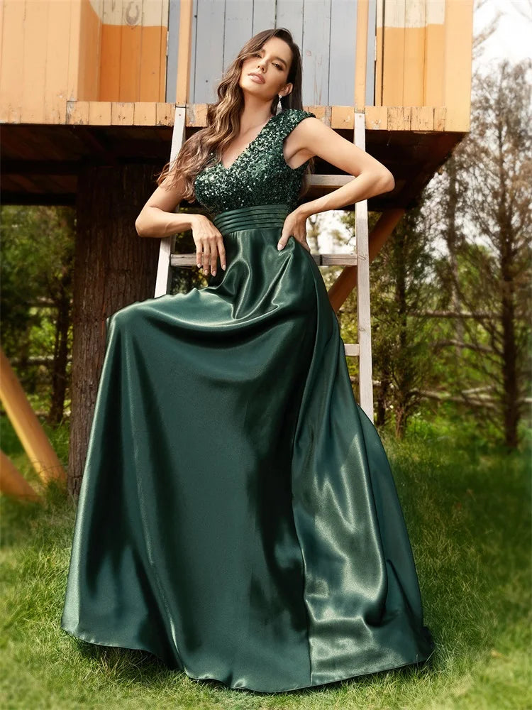 Turn heads with the Cap Sleeves V-Neckline Satin Sequin Bridesmaid Dress, a stunning floor-length gown designed for formal occasions like weddings, proms, and evening galas. Its rich emerald hue, combined with intricate sequin details, offers an eye-catching yet refined look perfect for special events.
