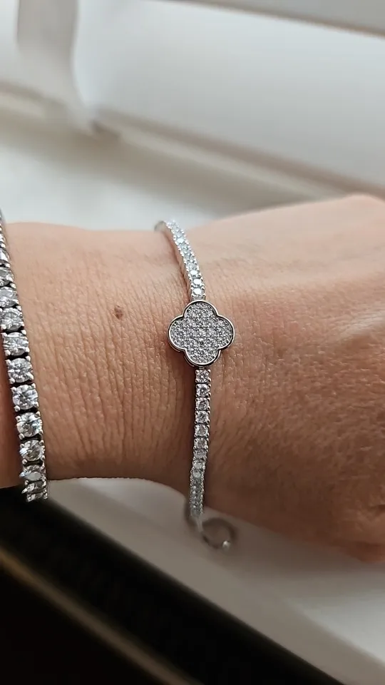 Elevate your everyday elegance with our Clover Adjustable Moissanite Tennis Bracelet, a symbol of luck and timeless sophistication. Crafted from 100% real 925 sterling silver and finished with a luminous 18K white gold plating, this bracelet radiates refinement and brilliance from every angle.