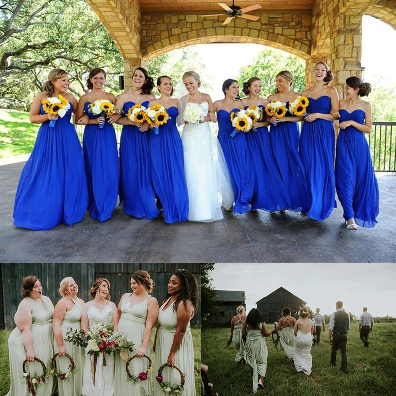 The dress features a wrap-style bodice, allowing for customizable necklines that range from demure sweetheart to daring halter. The infinity design empowers wearers to transform the silhouette, from classic A-line to captivating mermaid, effortlessly adapting to each bridesmaid's unique body shape and style preference.