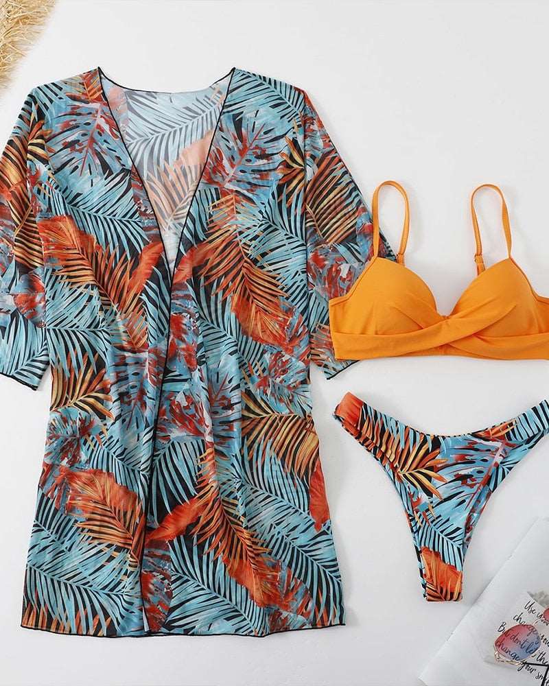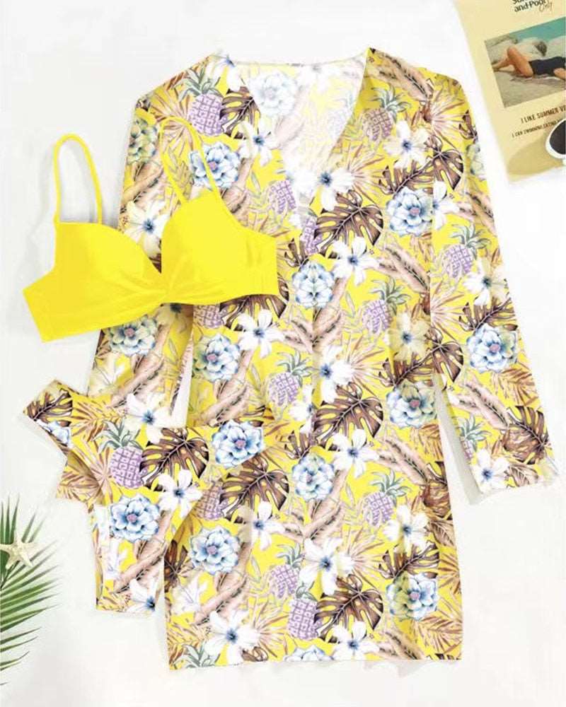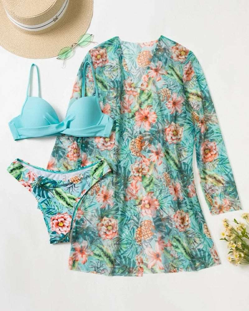 13 Color Floral 3 Pieces Low Waist Bikini Set with a Matching Cover-up Kimono