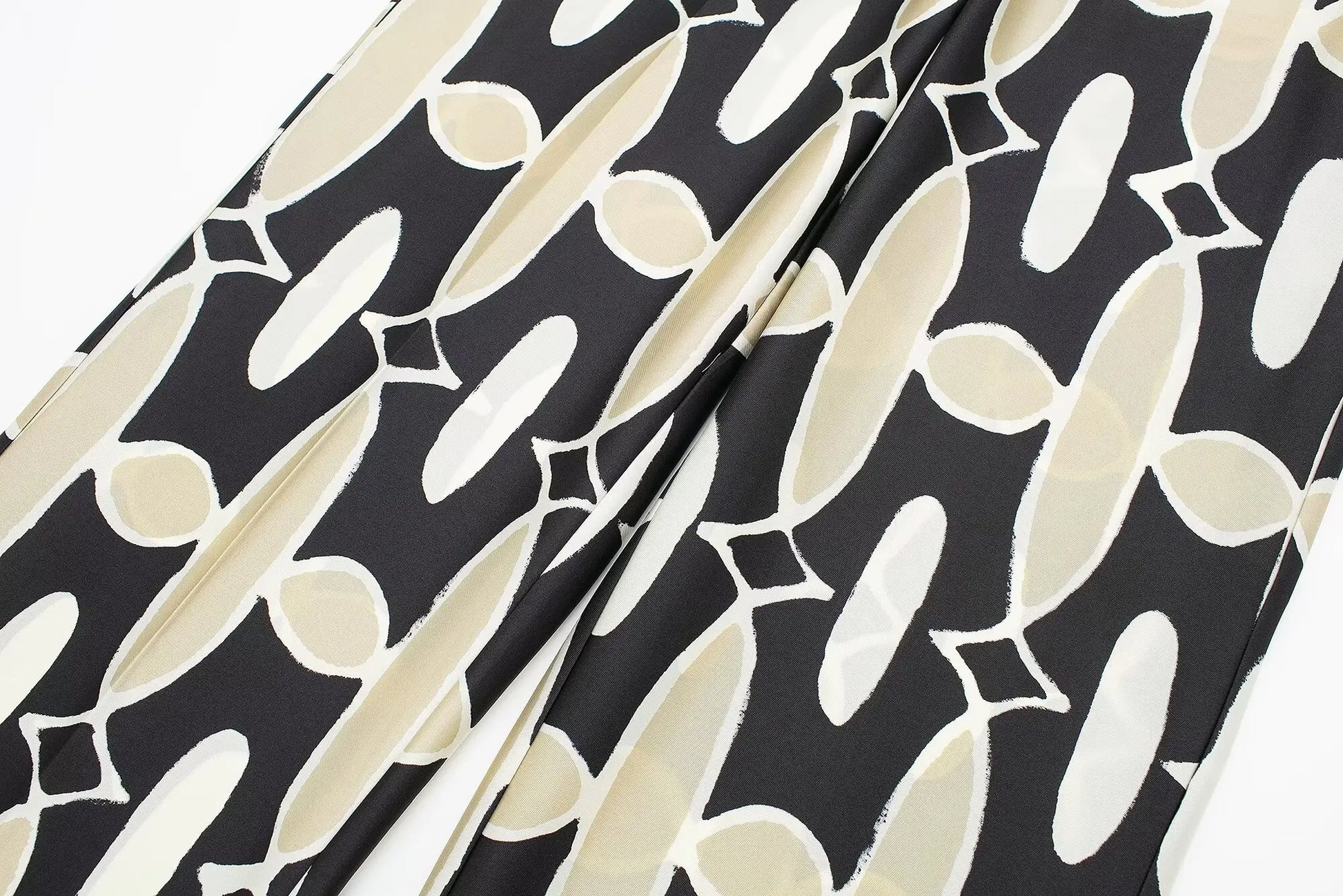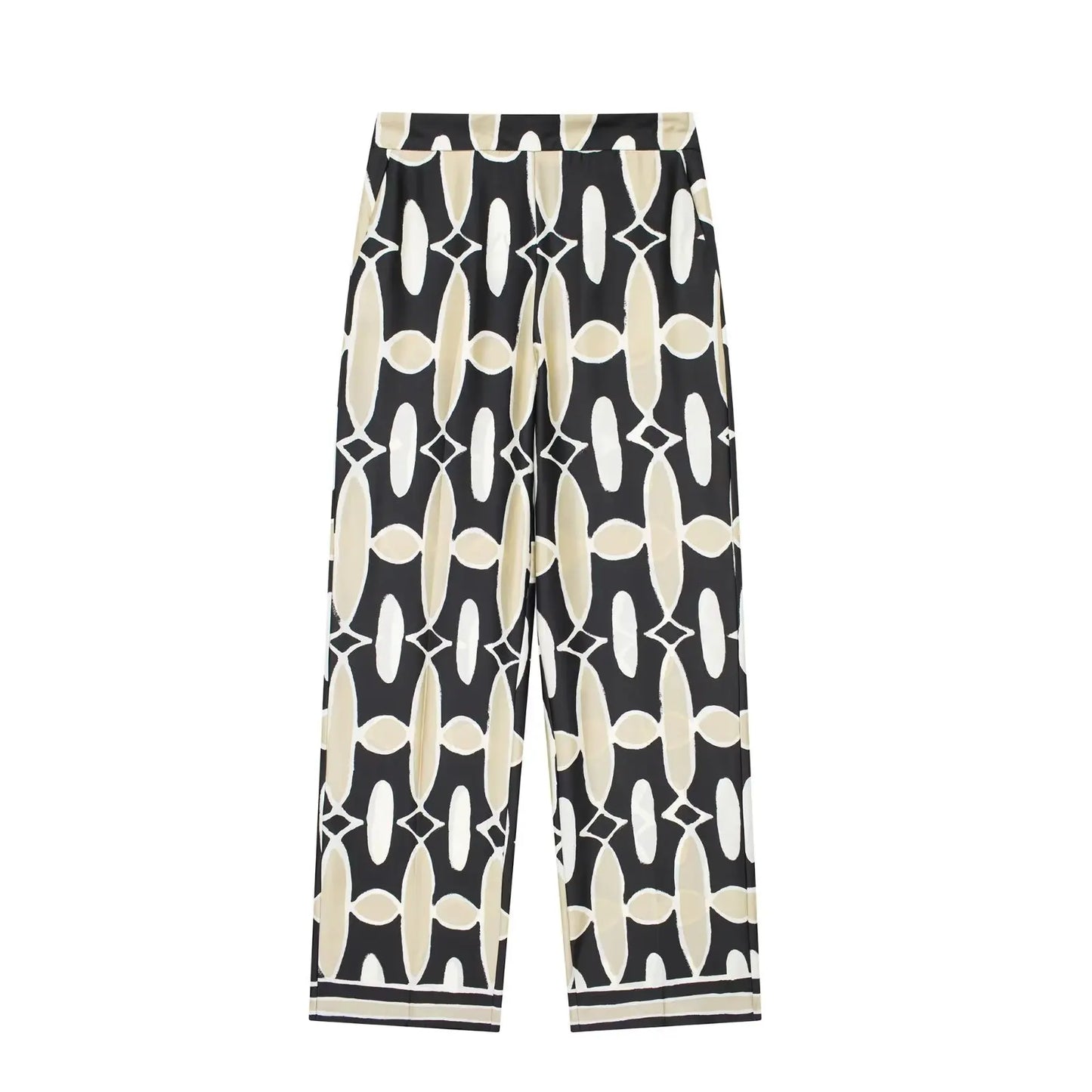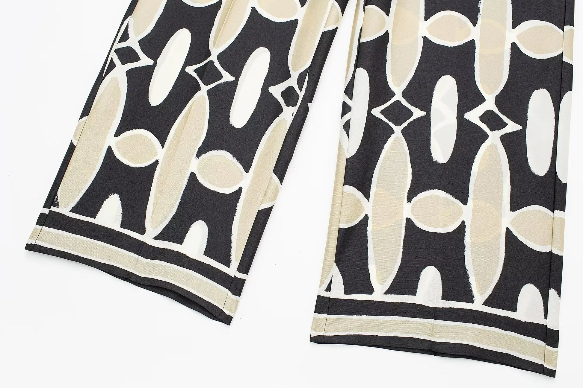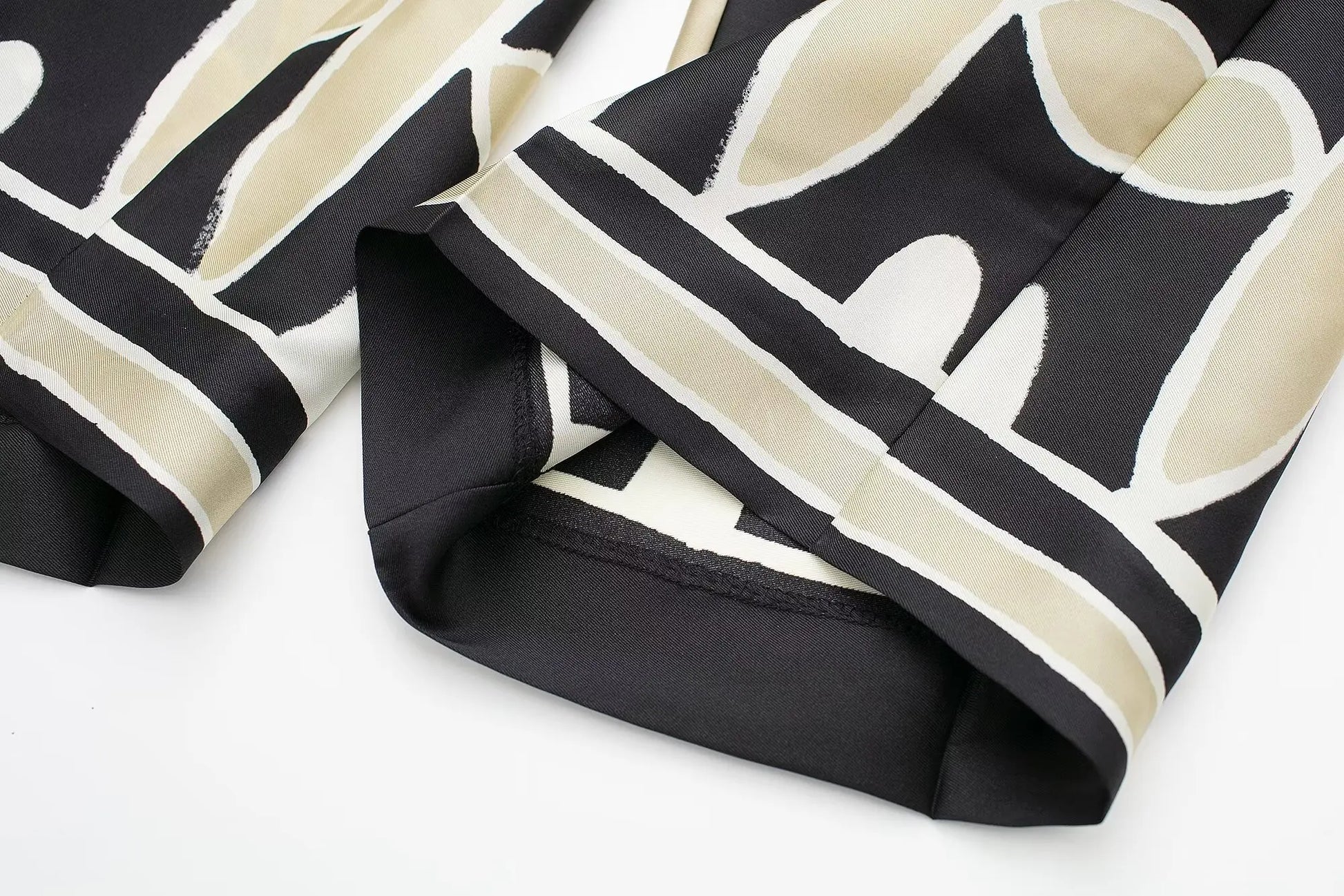 - Pants: High-waisted with a tailored fit, featuring a subtle geometric pattern.