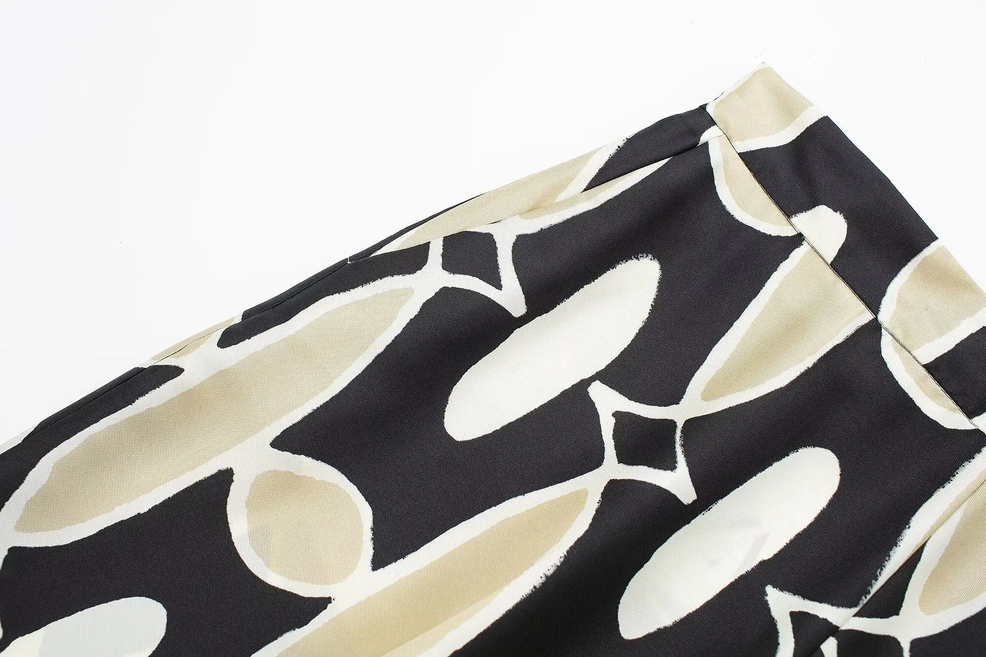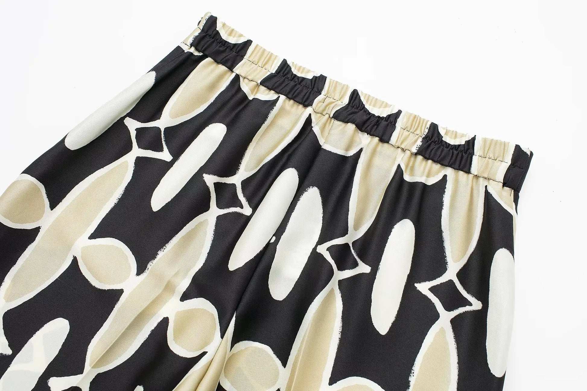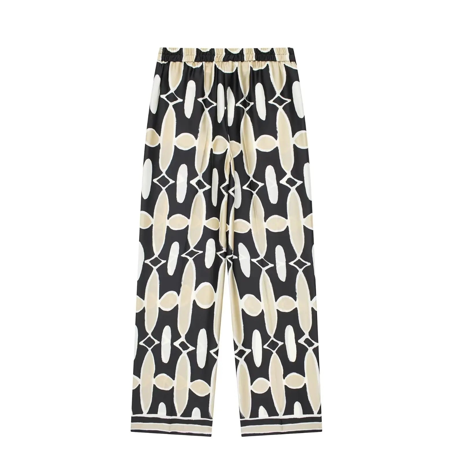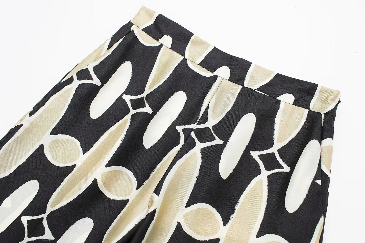 - Pants: High-waisted with a tailored fit, featuring a subtle geometric pattern.