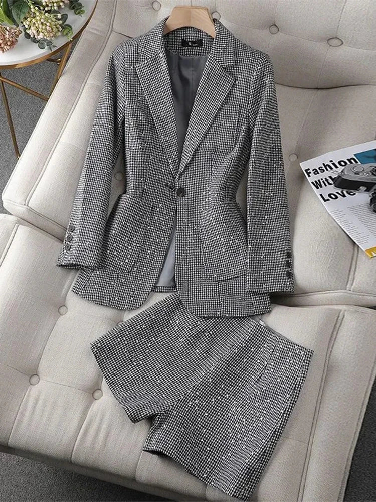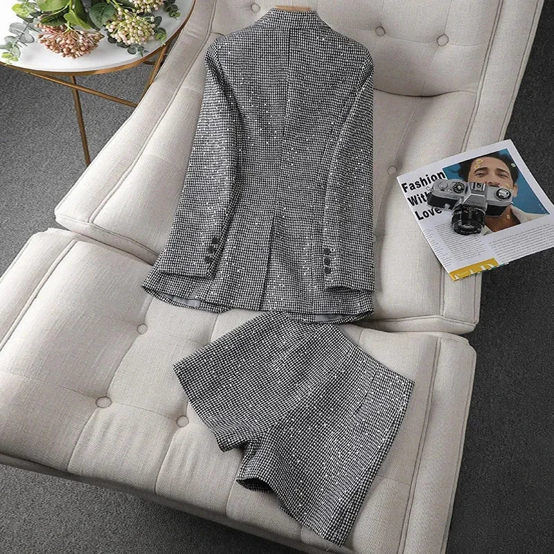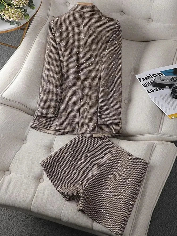 Elevate your style with our Houndstooth Sequin Blazer and Shorts Suit, the perfect ensemble for those who want to combine classic patterns with modern glamour.