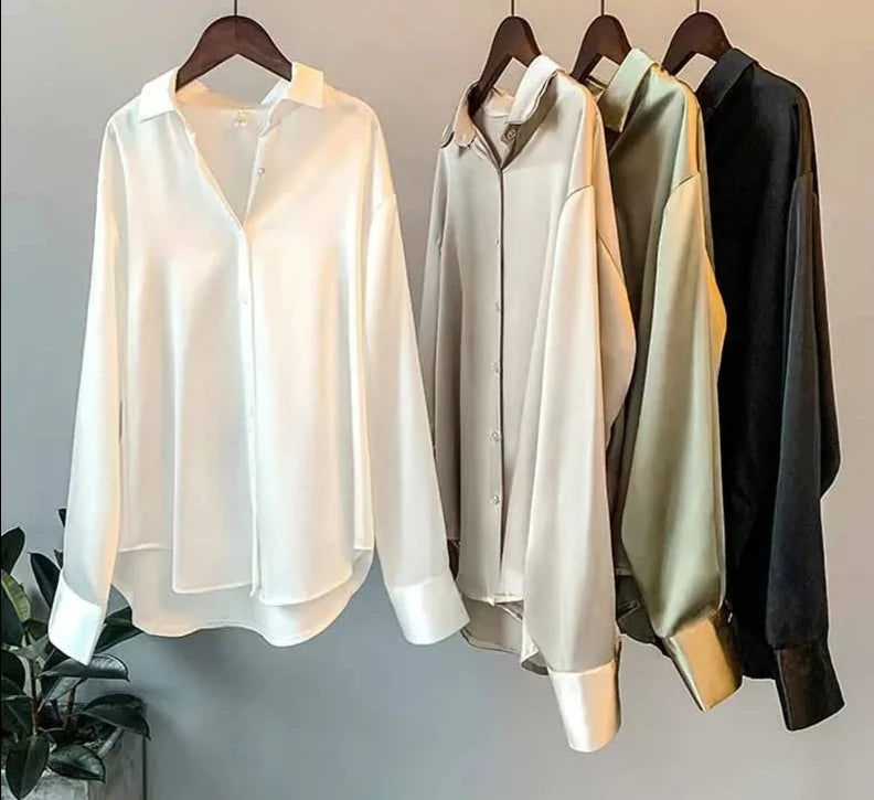 Long Sleeve Button Up Silk Like Blouse Shirt