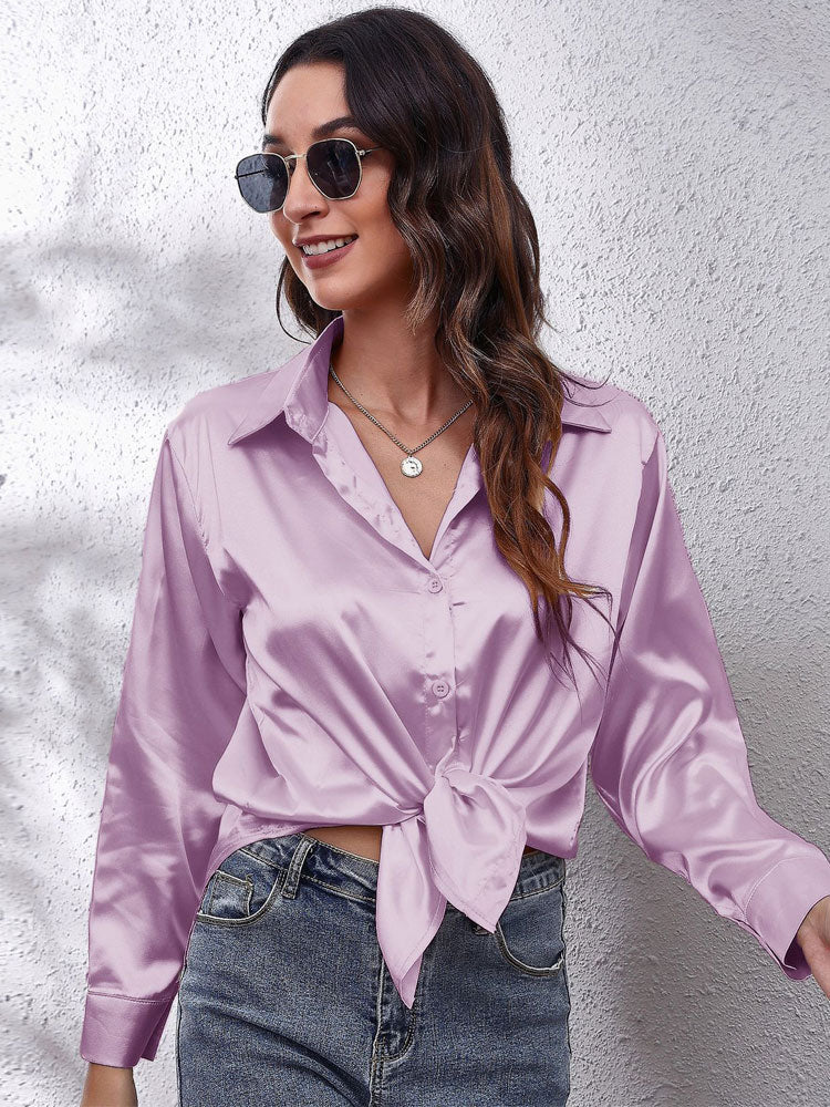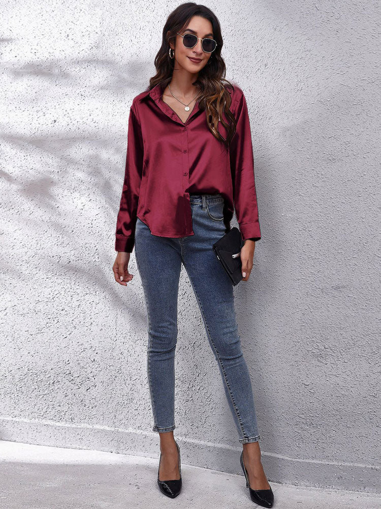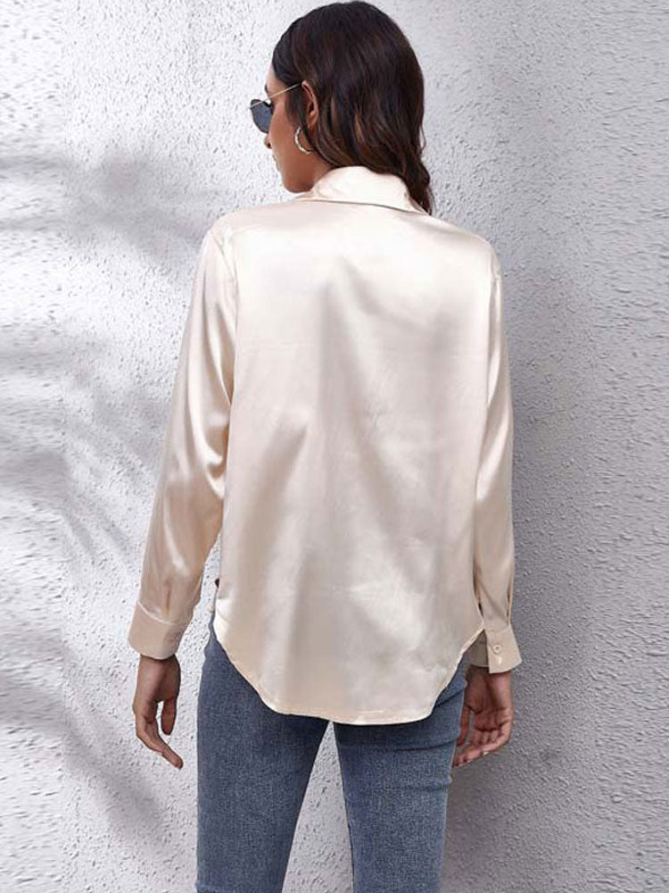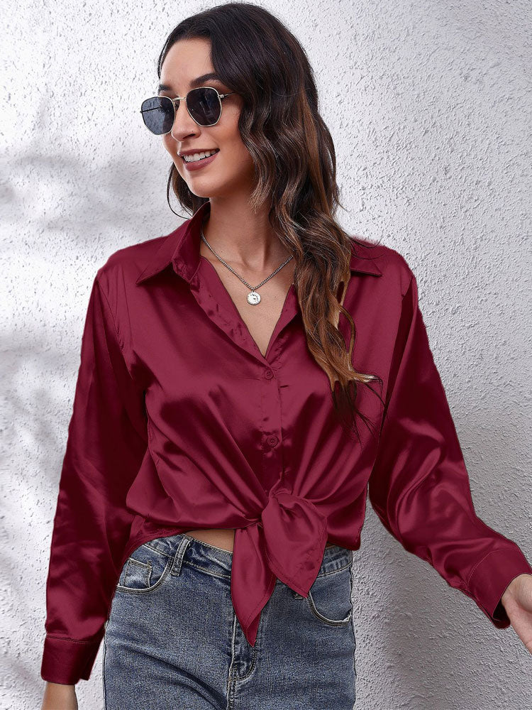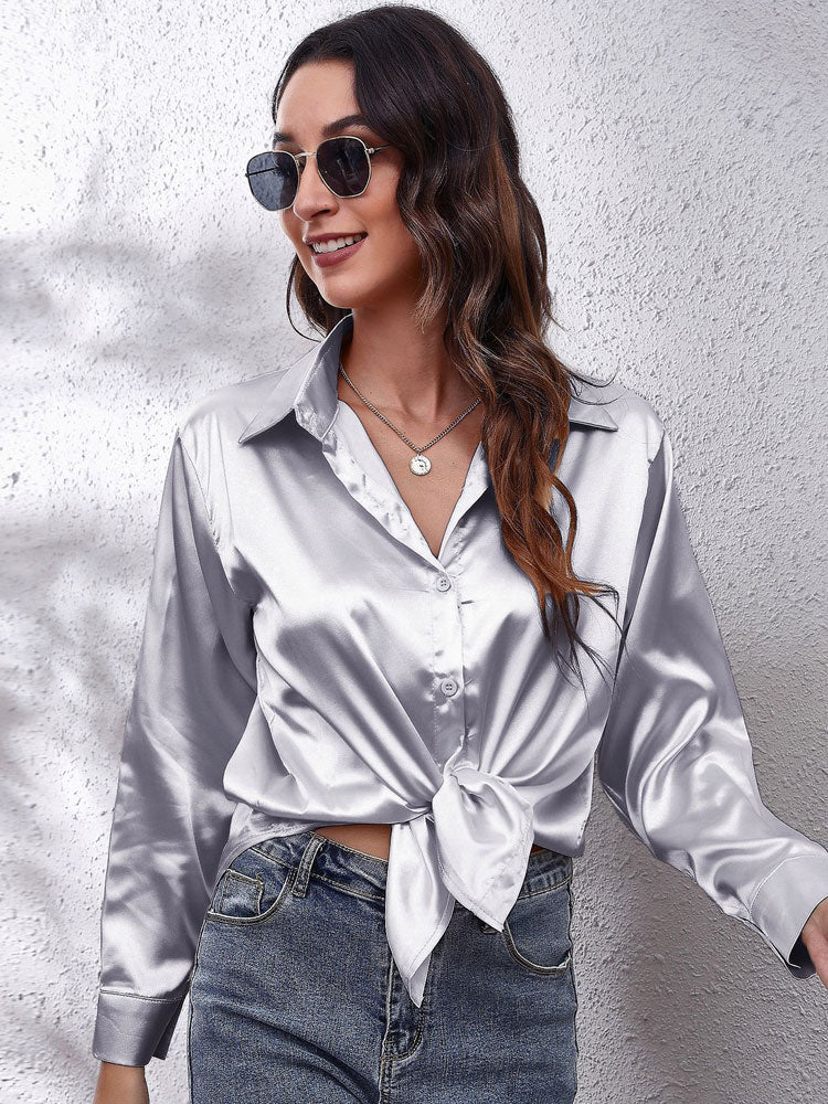 Loose Fit Satin Long Sleeve Button Up Blouse Shirt