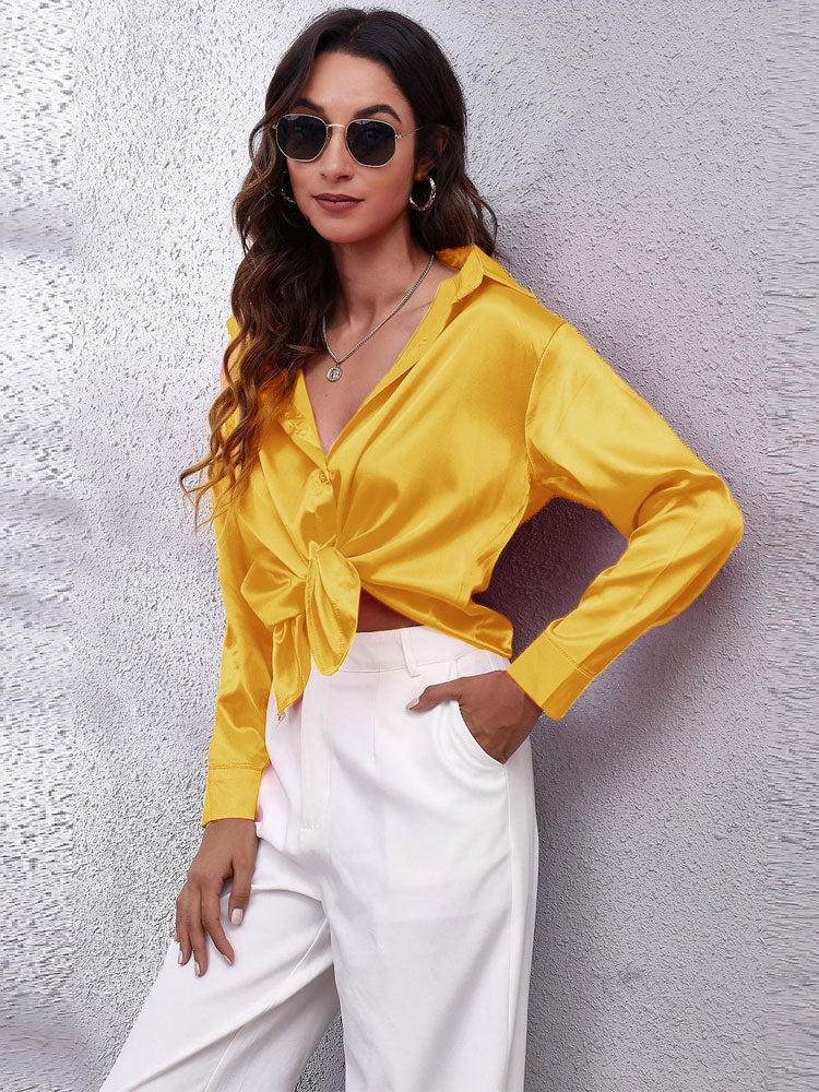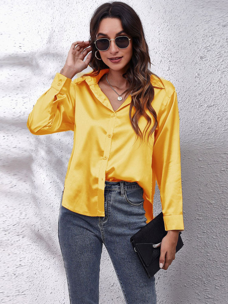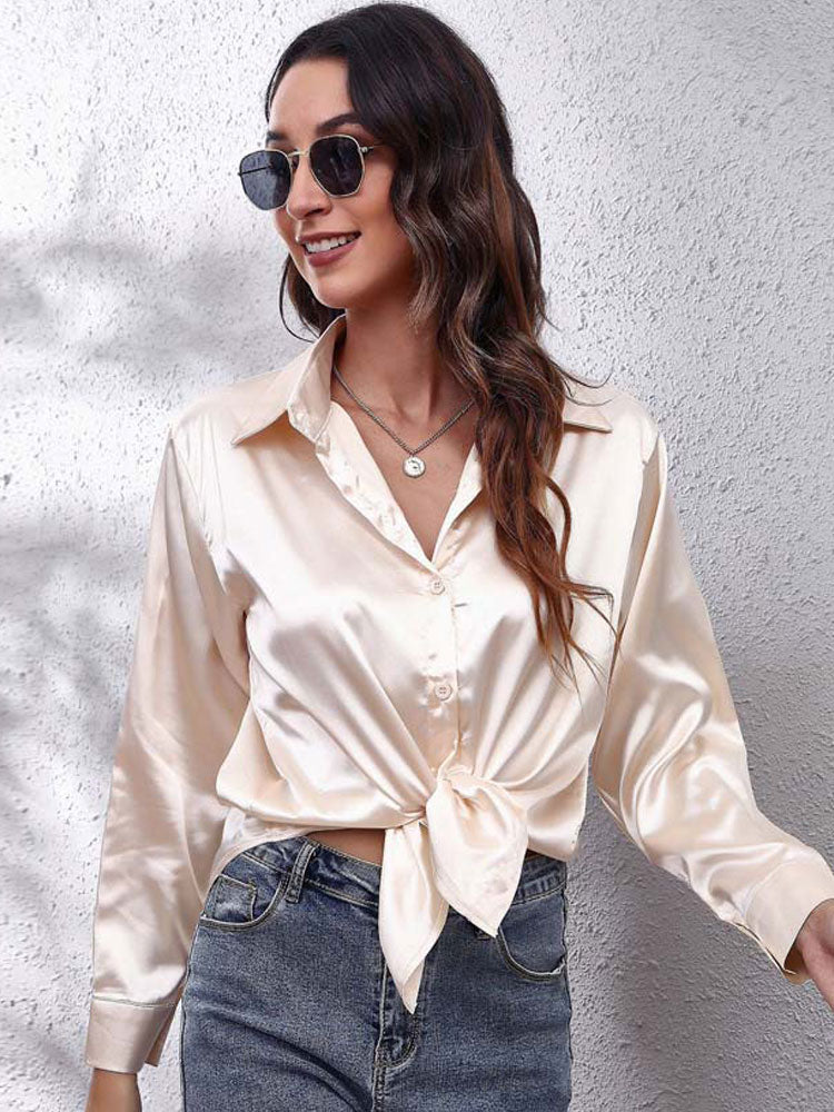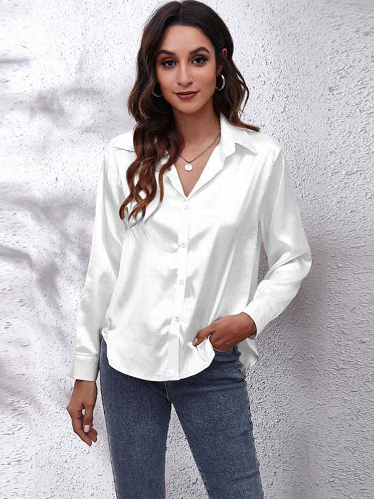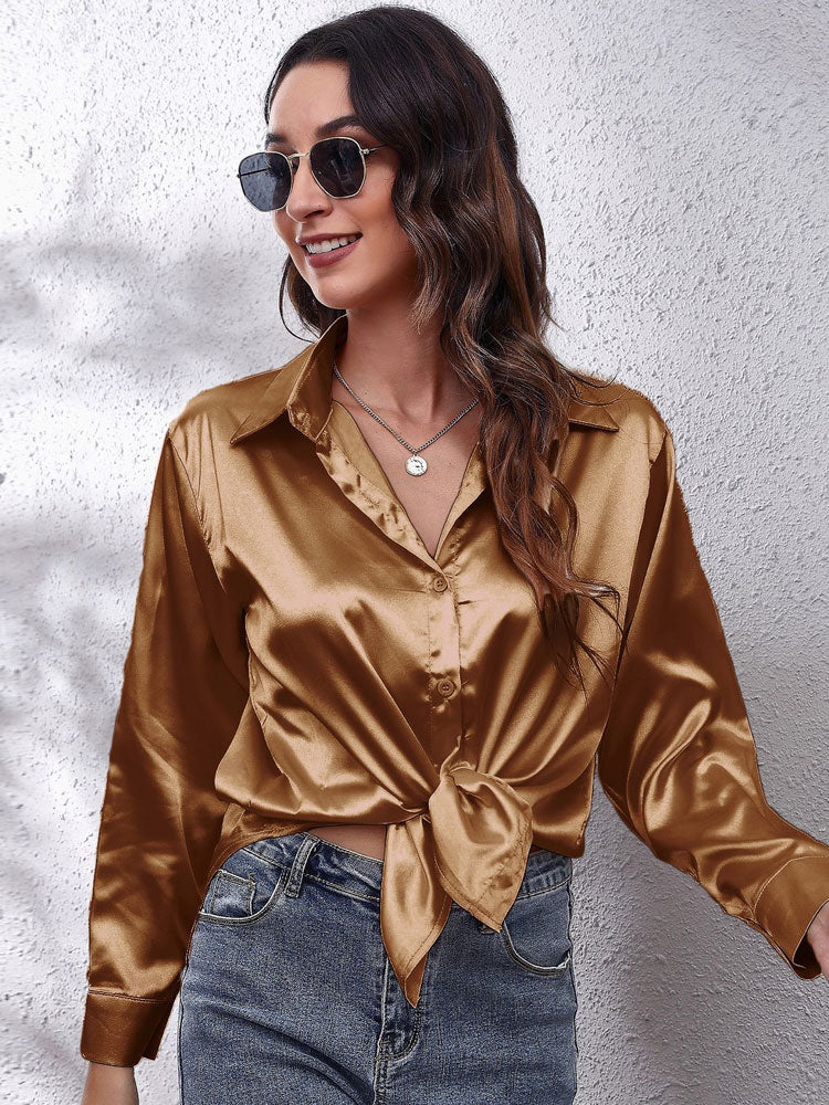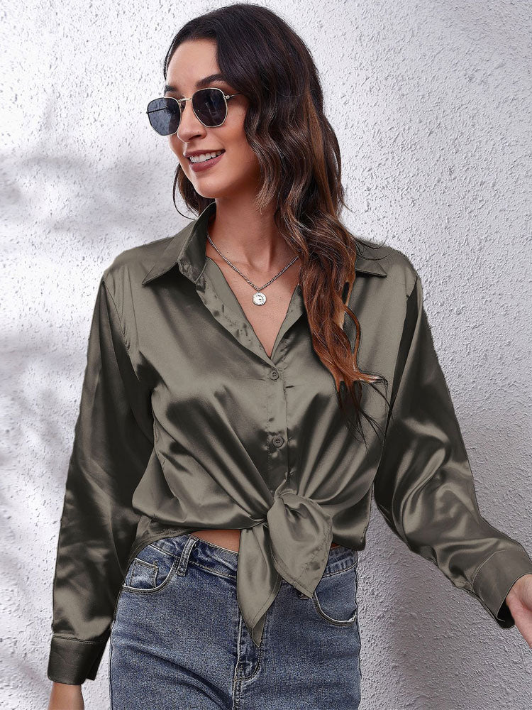 Loose Fit Satin Long Sleeve Button Up Blouse Shirt