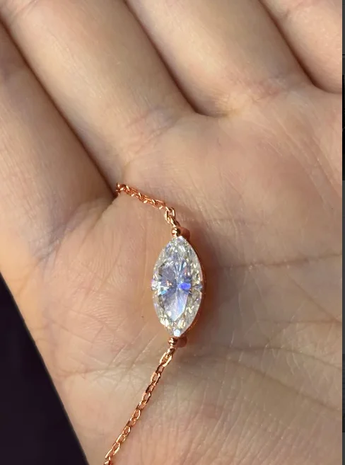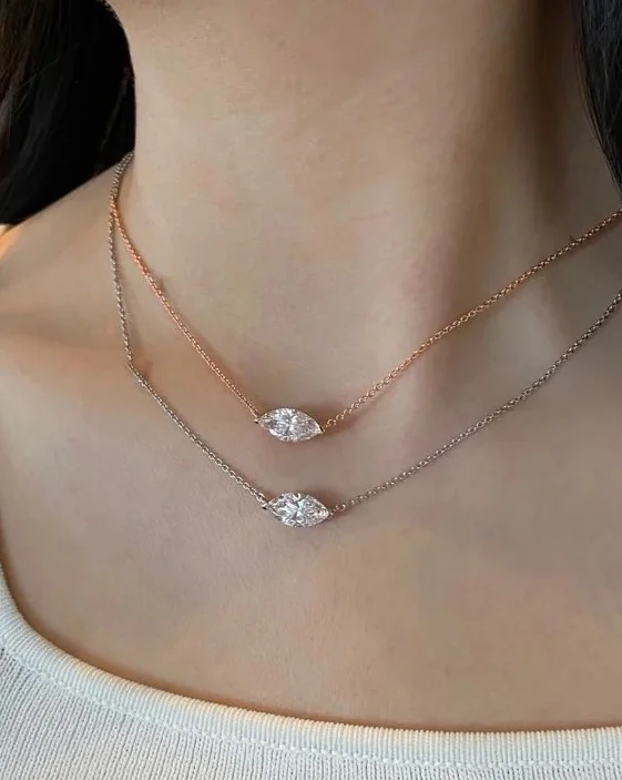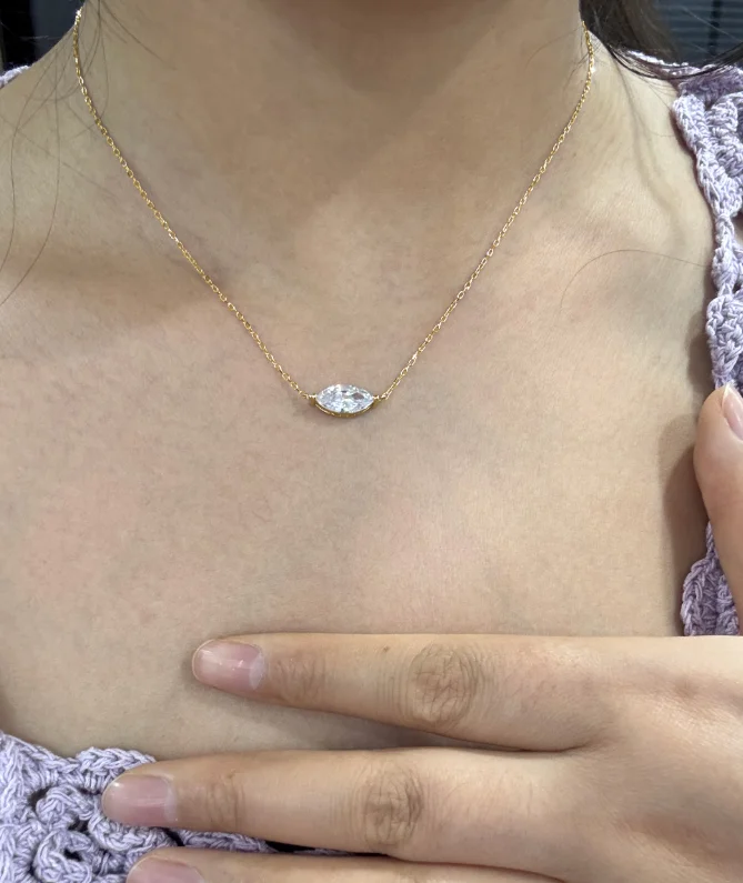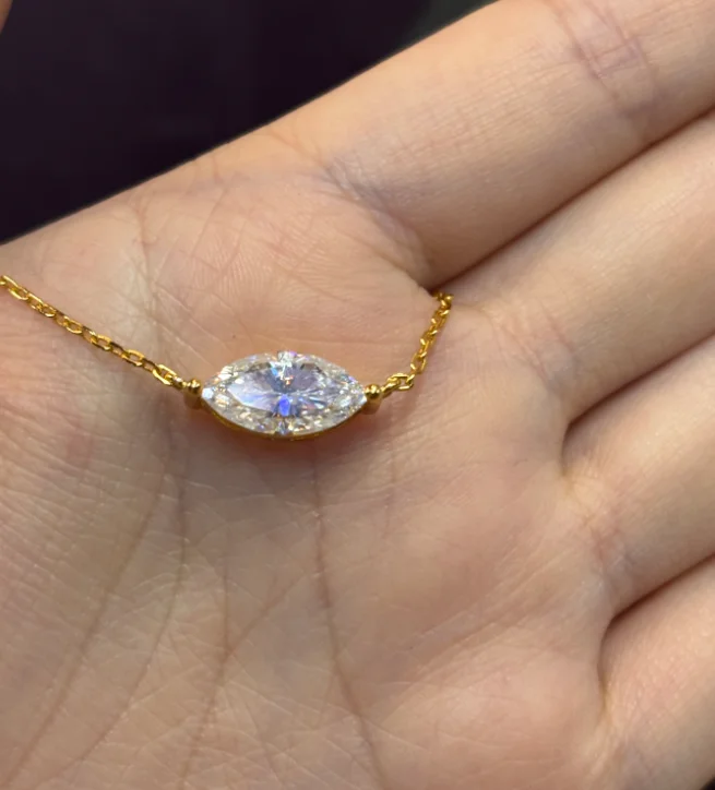 Refined elegance meets timeless brilliance in this Marquise Cut Solitaire Moissanite Necklace, a statement of pure sophistication and modern minimalism. Set in 18K gold-plated 925 sterling silver, the East-West marquise cut Moissanite radiates exceptional sparkle and fire with every movement.