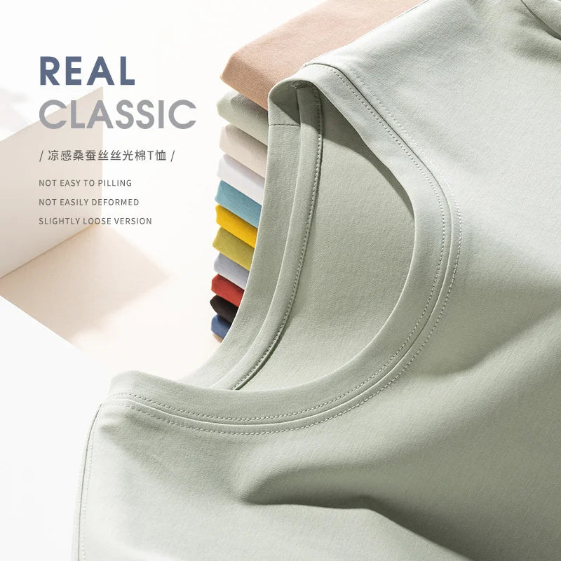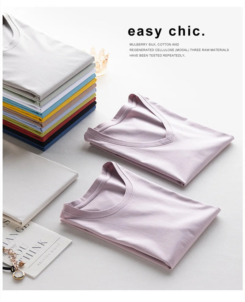 Elevate your everyday style with the Mulberry Silk Solid Color Round Neckline T-shirt. This T-shirt blends luxurious Mulberry silk with the soft comfort of cotton and the durability of Modal, creating a wardrobe staple that feels as good as it looks. Its minimalist design and premium fabric make it perfect for any occasion, from casual outings to more refined settings.