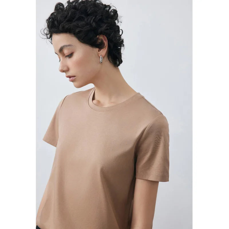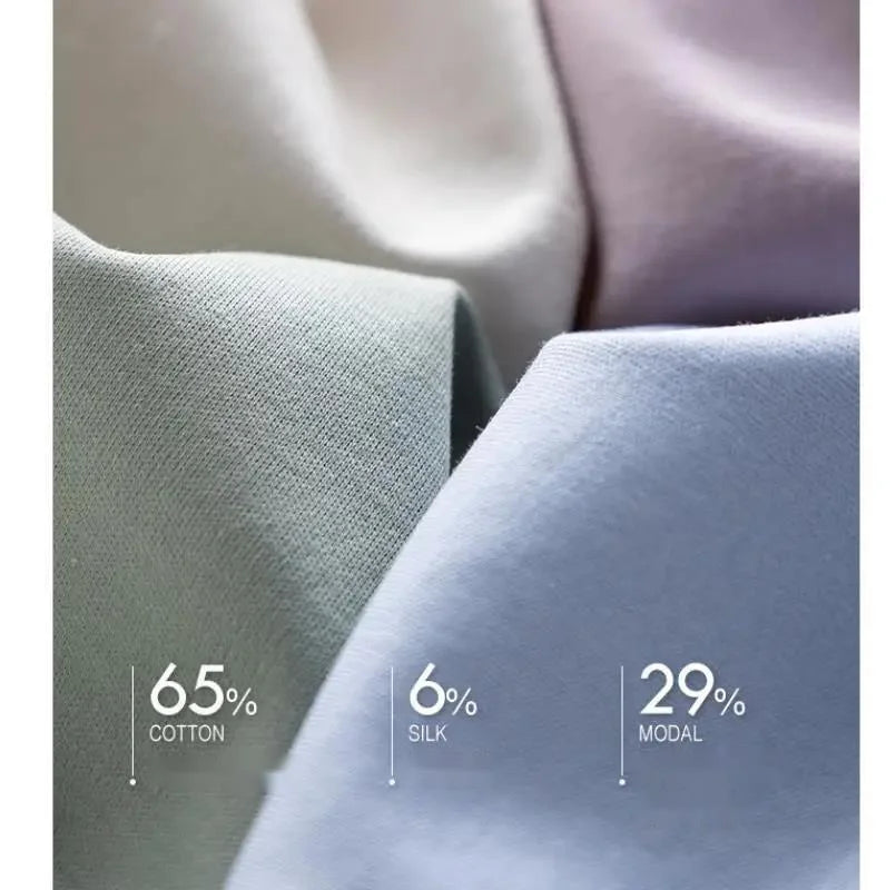 • Crafted from 66% cotton, 6% Mulberry silk, and 28% Modal, this T-shirt combines the breathability and comfort of cotton, the luxurious sheen of silk, and the resilience of Modal. The result is a soft, smooth fabric that drapes beautifully and feels gentle on the skin.