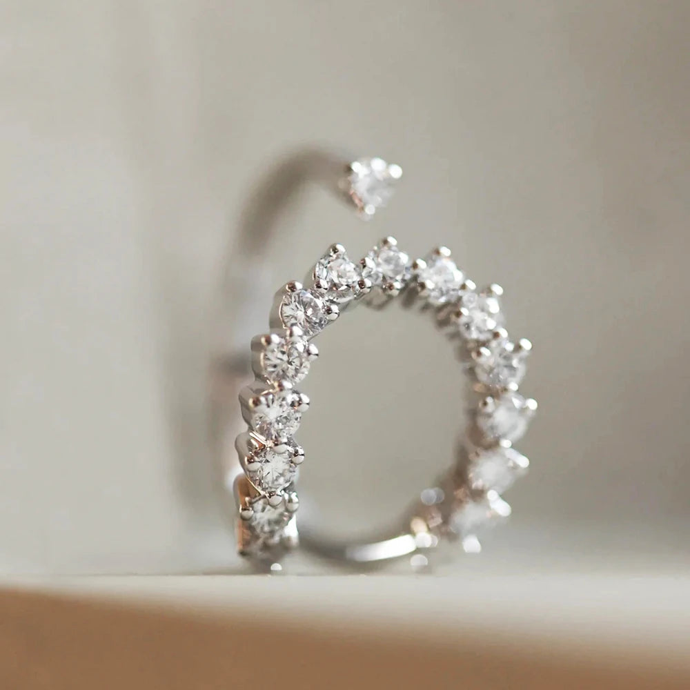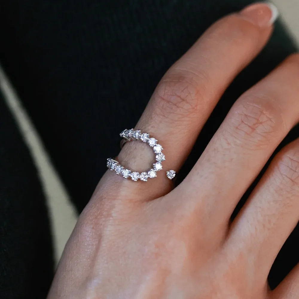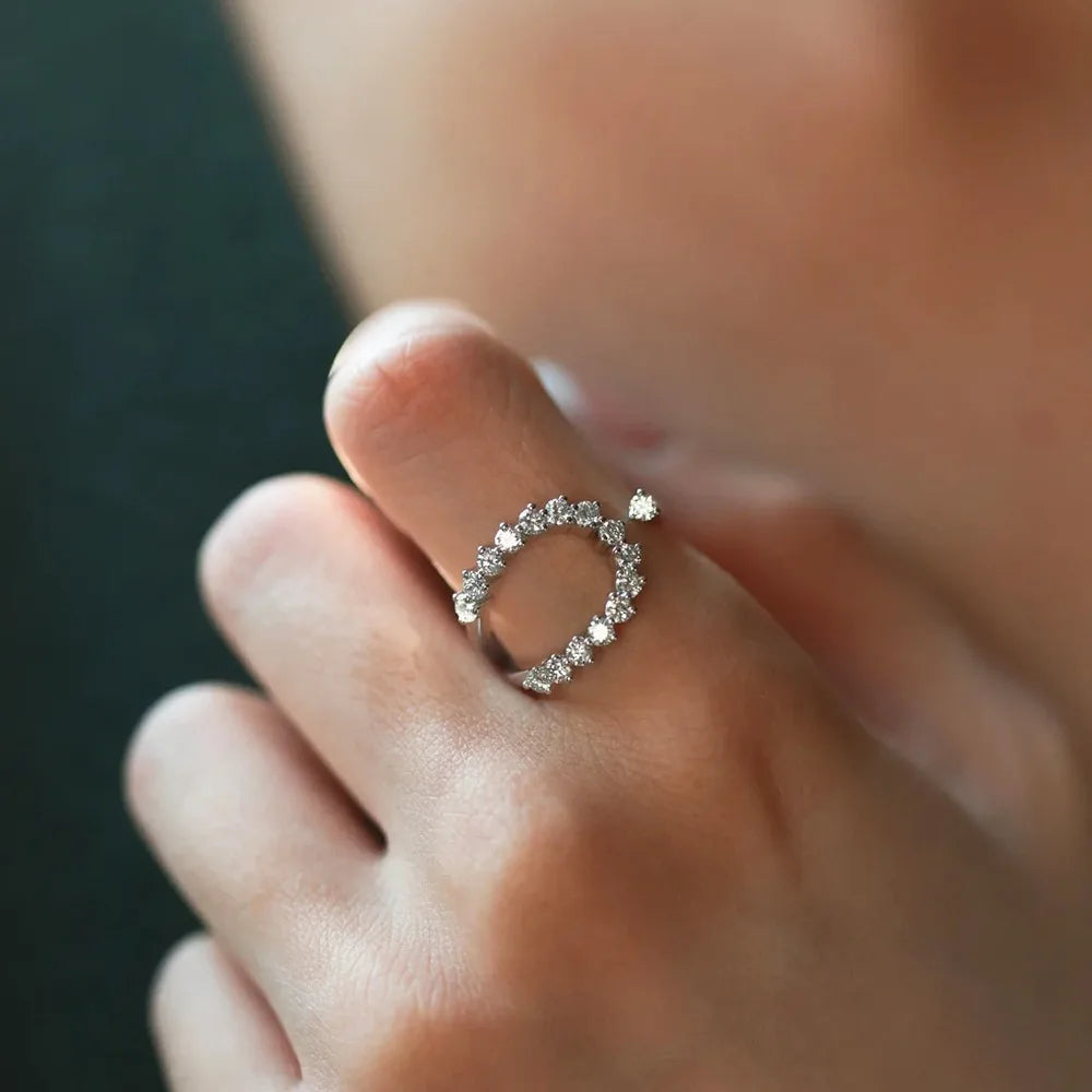 The asymmetrical open band is both contemporary and refined, designed to rest comfortably on the pinky finger while making a bold, minimalist statement. Each moissanite stone is VVS1 clarity with an excellent cut, and comes with a GRA certification to ensure authenticity and diamond-equivalent brilliance.