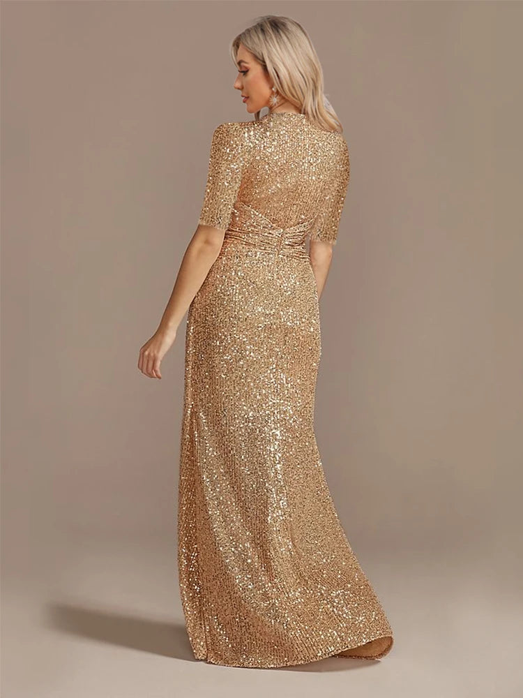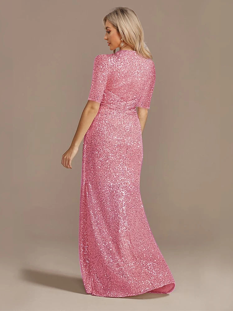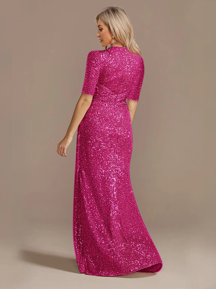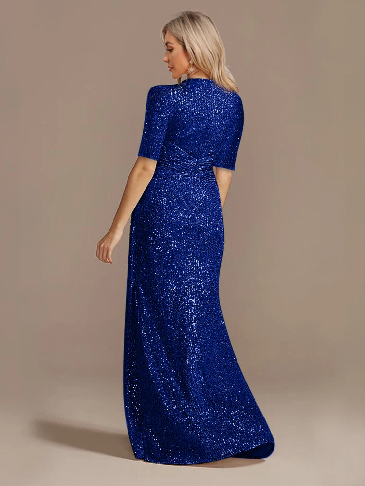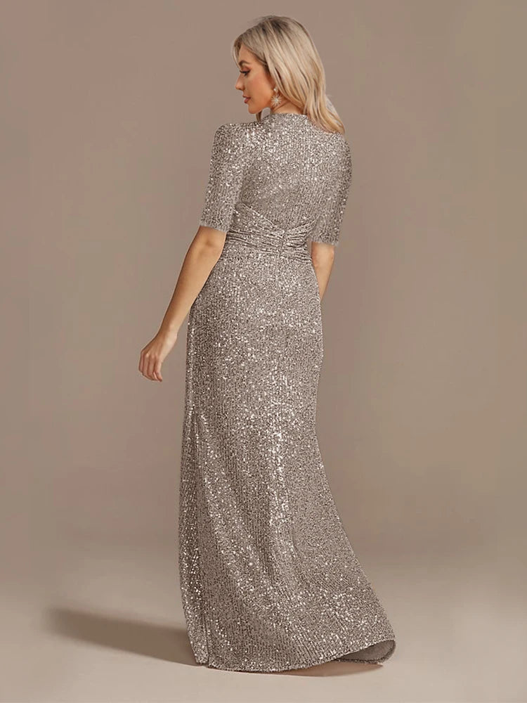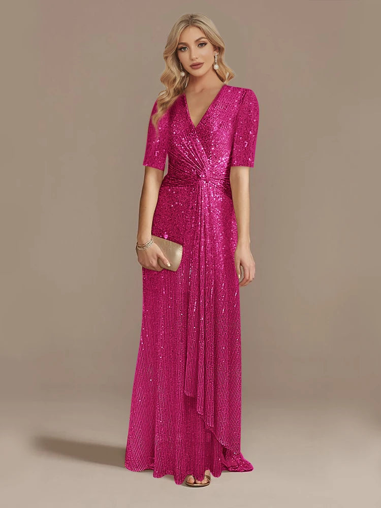 Short Sleeve V-Neckline Floor Length Evening Dress - Sequin Mother of the Bride Dress