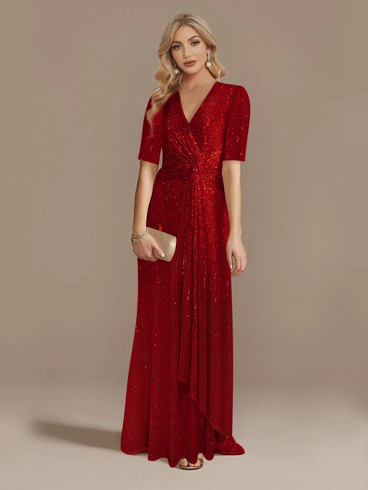 Elegance meets sophistication in this Short Sleeve V-Neckline Floor Length Evening Dress, crafted specifically for the Mother of the Bride. Featuring a stunning sequin design and a twist detail on the waist, this gown is perfect for creating a graceful and flattering silhouette.