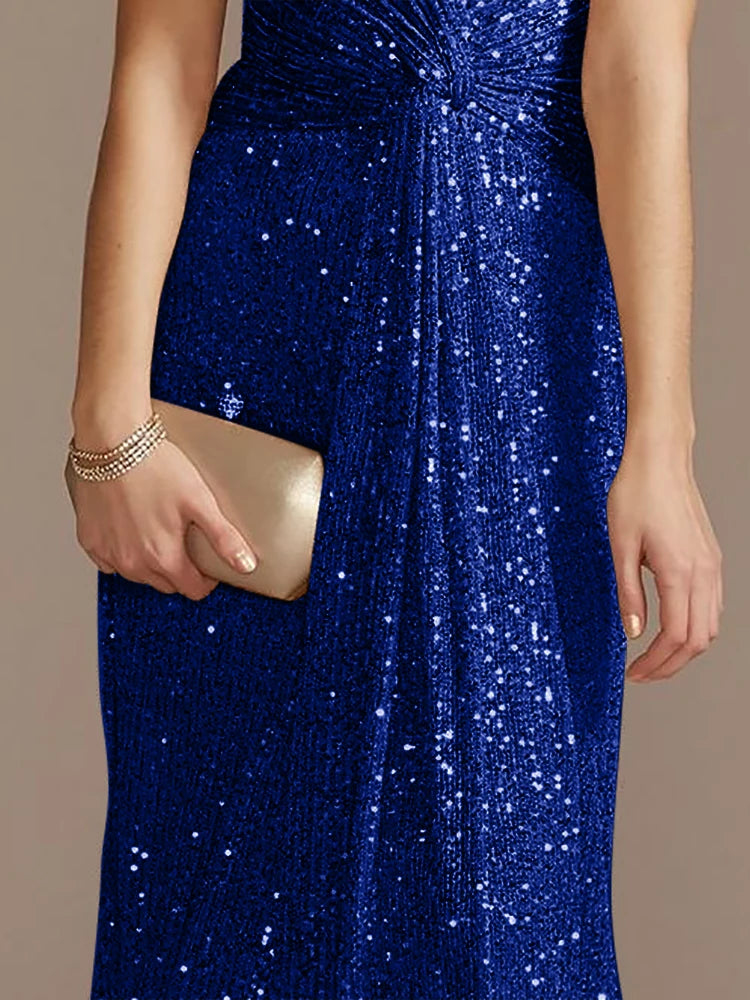 • Fabric & Design: This dress is adorned with shimmering sequins throughout, offering a radiant look for any special occasion. The V-neckline and short sleeves provide a timeless, elegant touch, while the twist detail at the waist accentuates your natural curves.