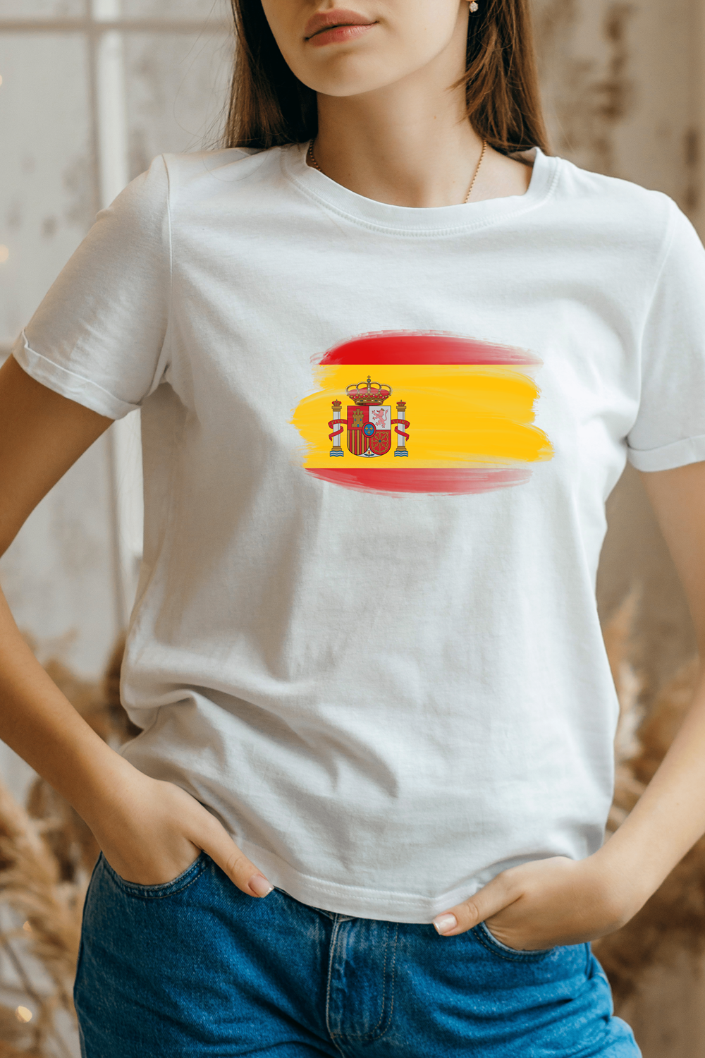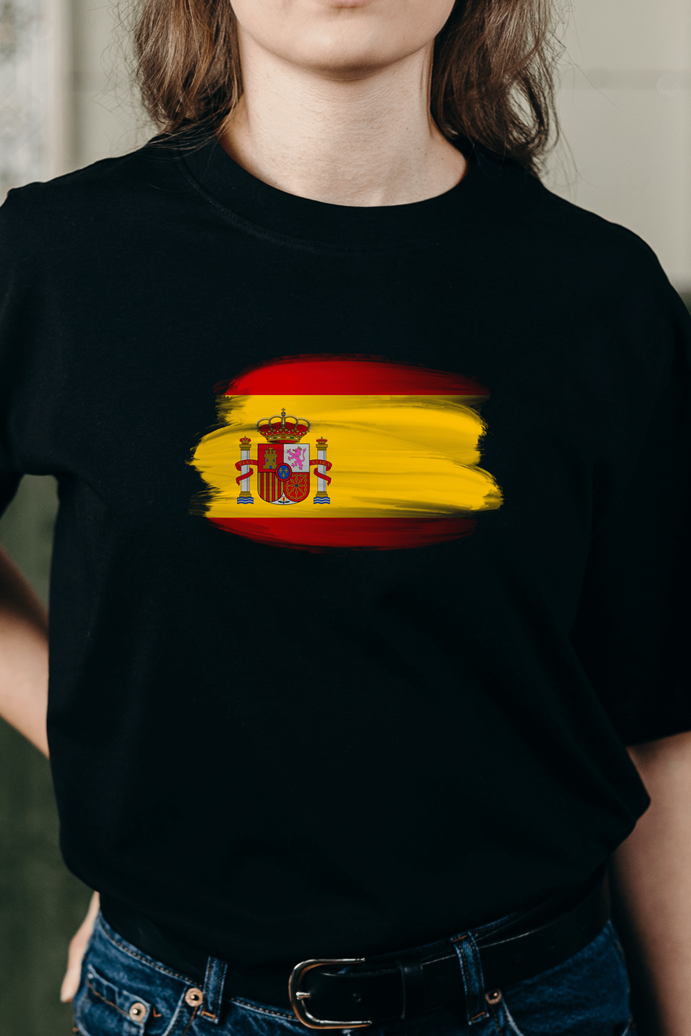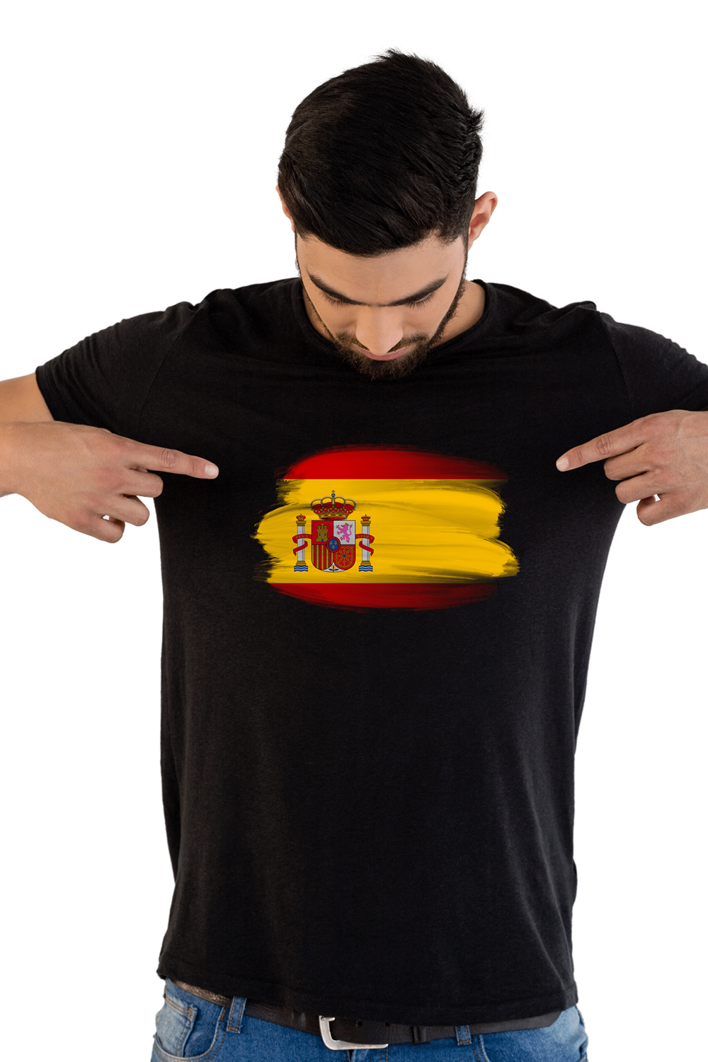 Featuring a bold and striking Spain flag print on the front, this t-shirt is perfect for showing off your patriotism and support for your country. The high-quality print is vibrant and long-lasting, ensuring that it will look great even after multiple washes.