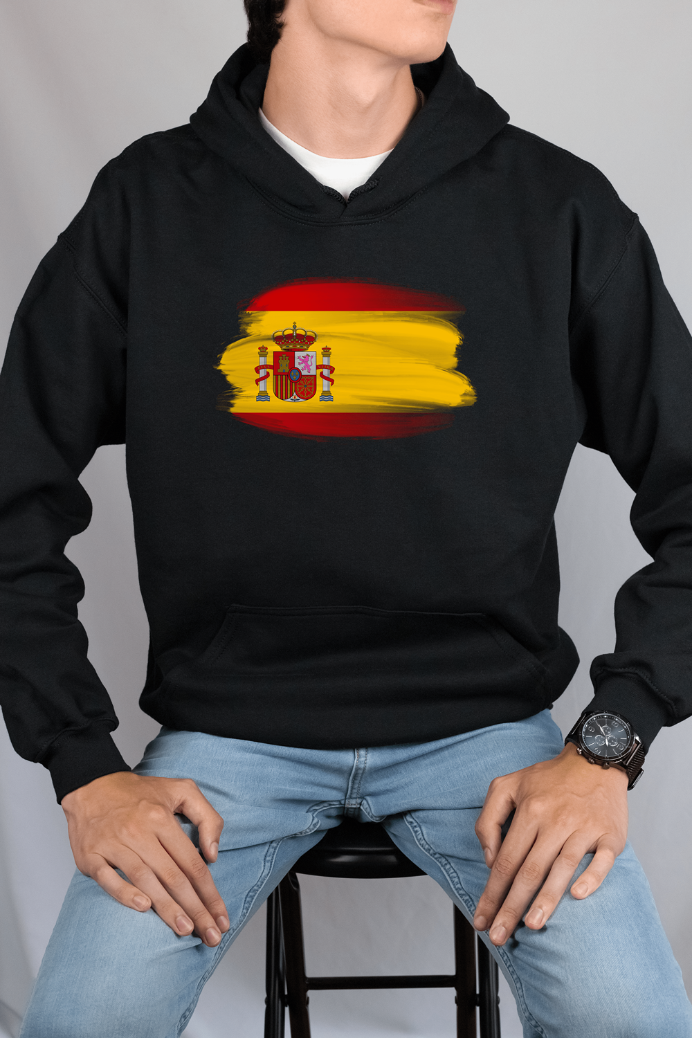 Featuring a bold and striking Spain flag print on the front, this hoodie is perfect for showing off your patriotism and support for your country. The high-quality print is vibrant and long-lasting, ensuring that it will look great even after multiple washes. The classic design of the hoodie makes it perfect for everyday wear, whether you're running errands around town or hanging out with friends.