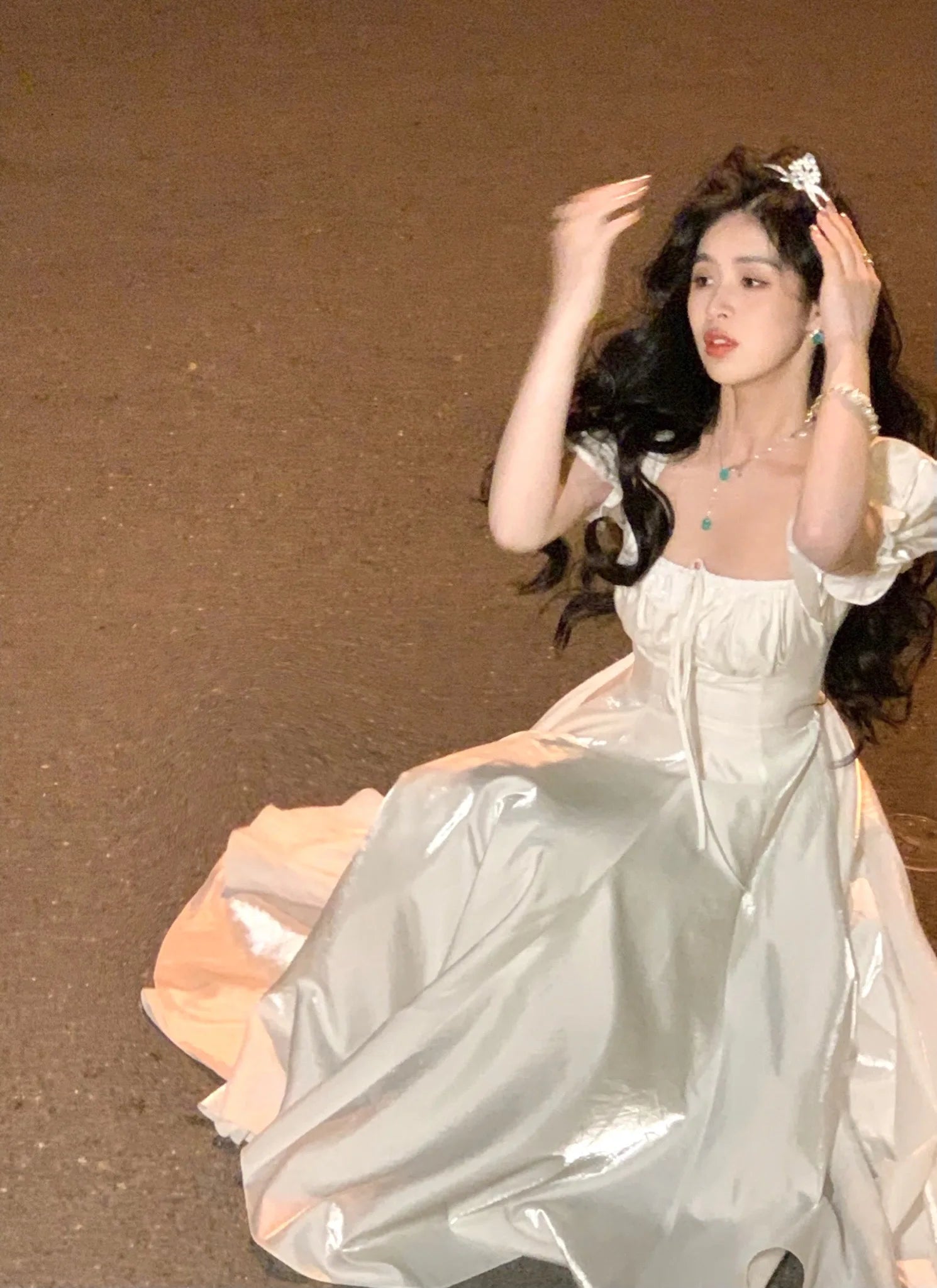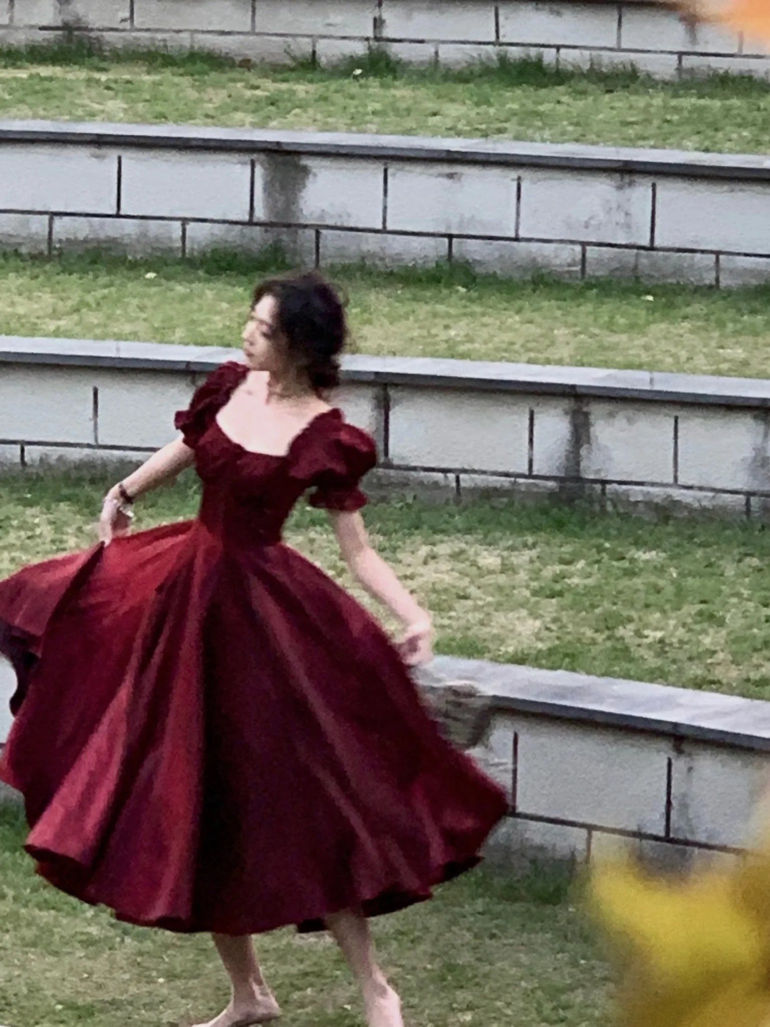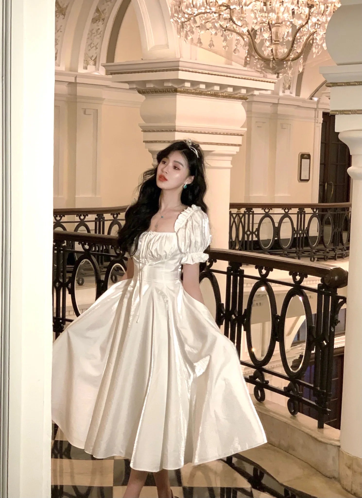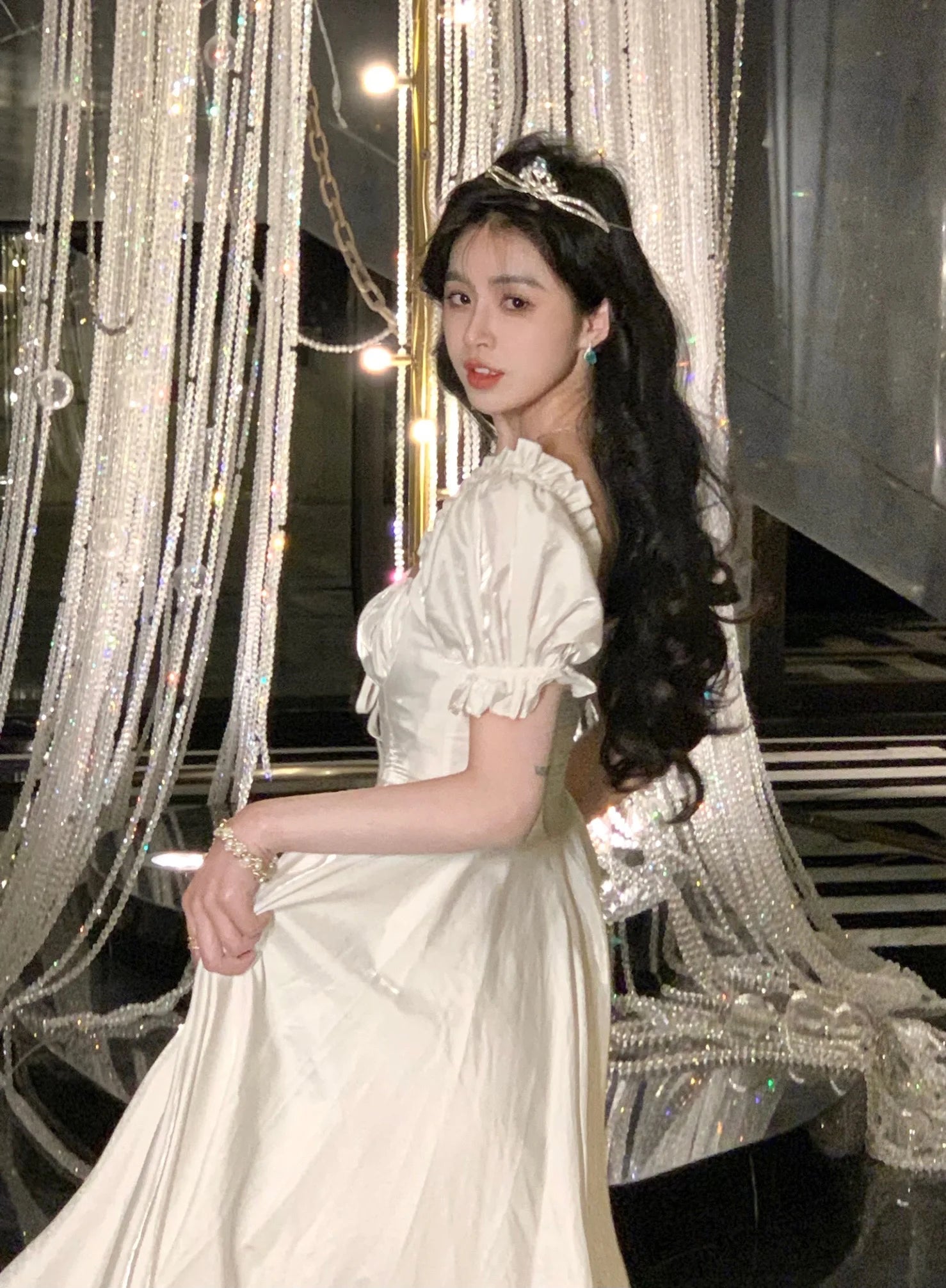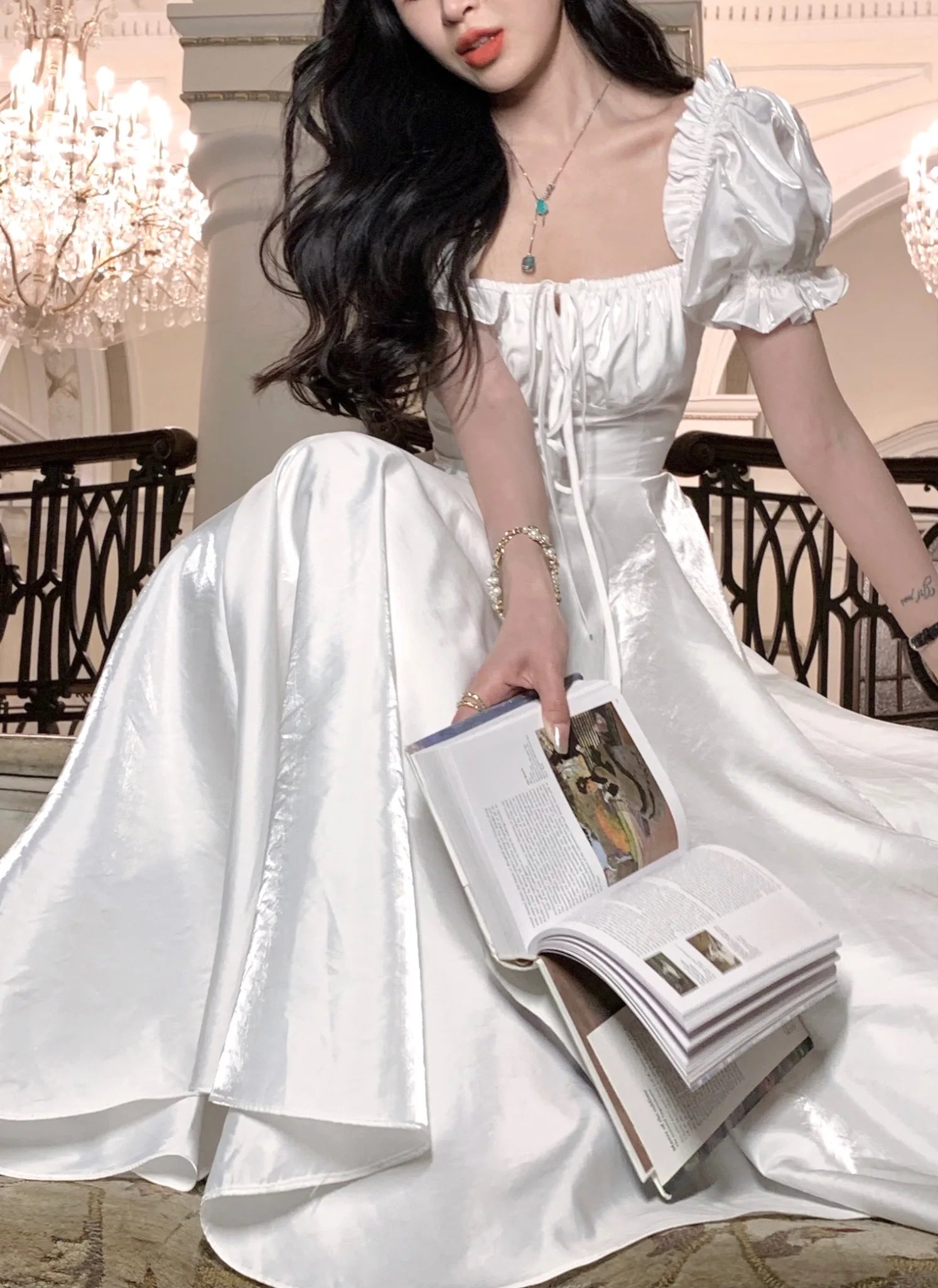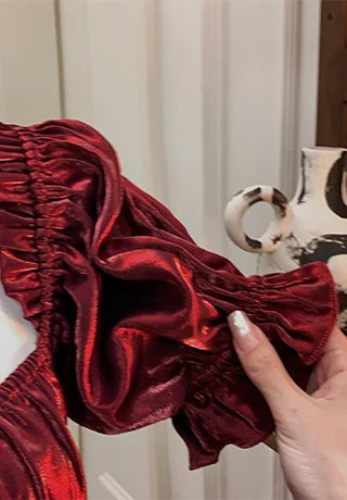 The short puff sleeves bring a playful and romantic vibe to the dress, adding volume and a touch of whimsy to the overall design.