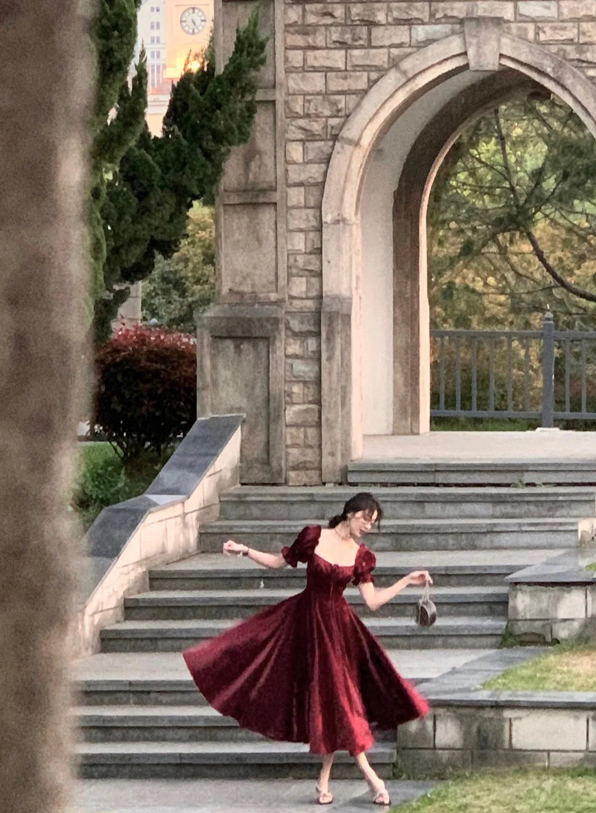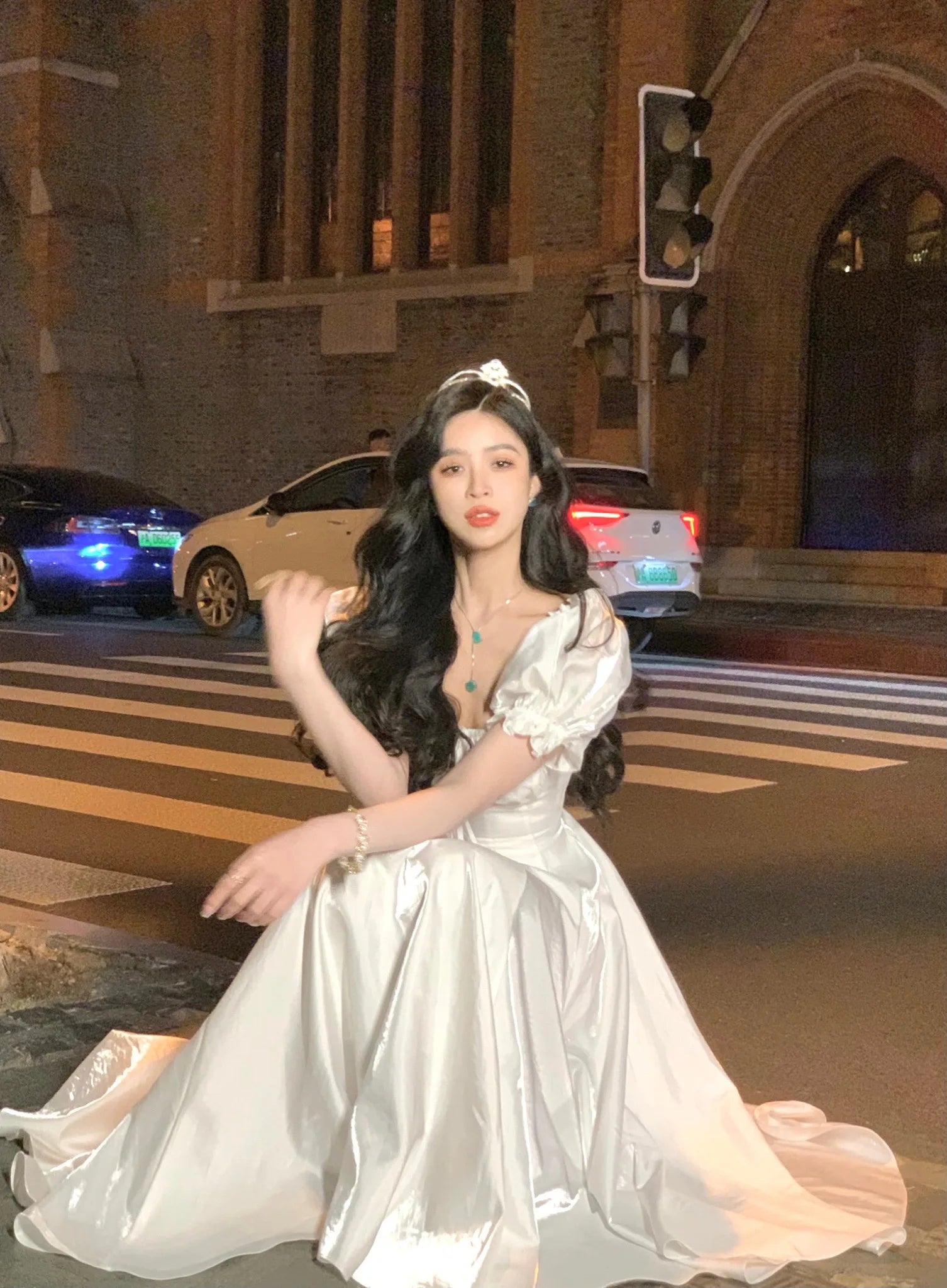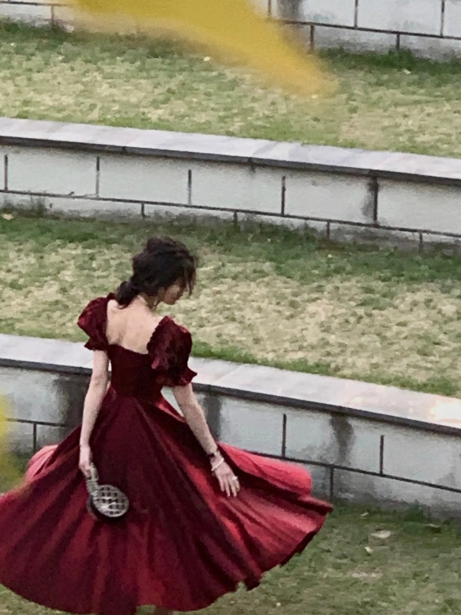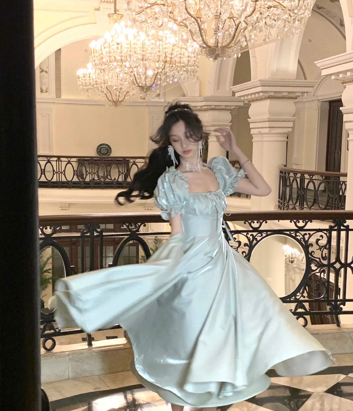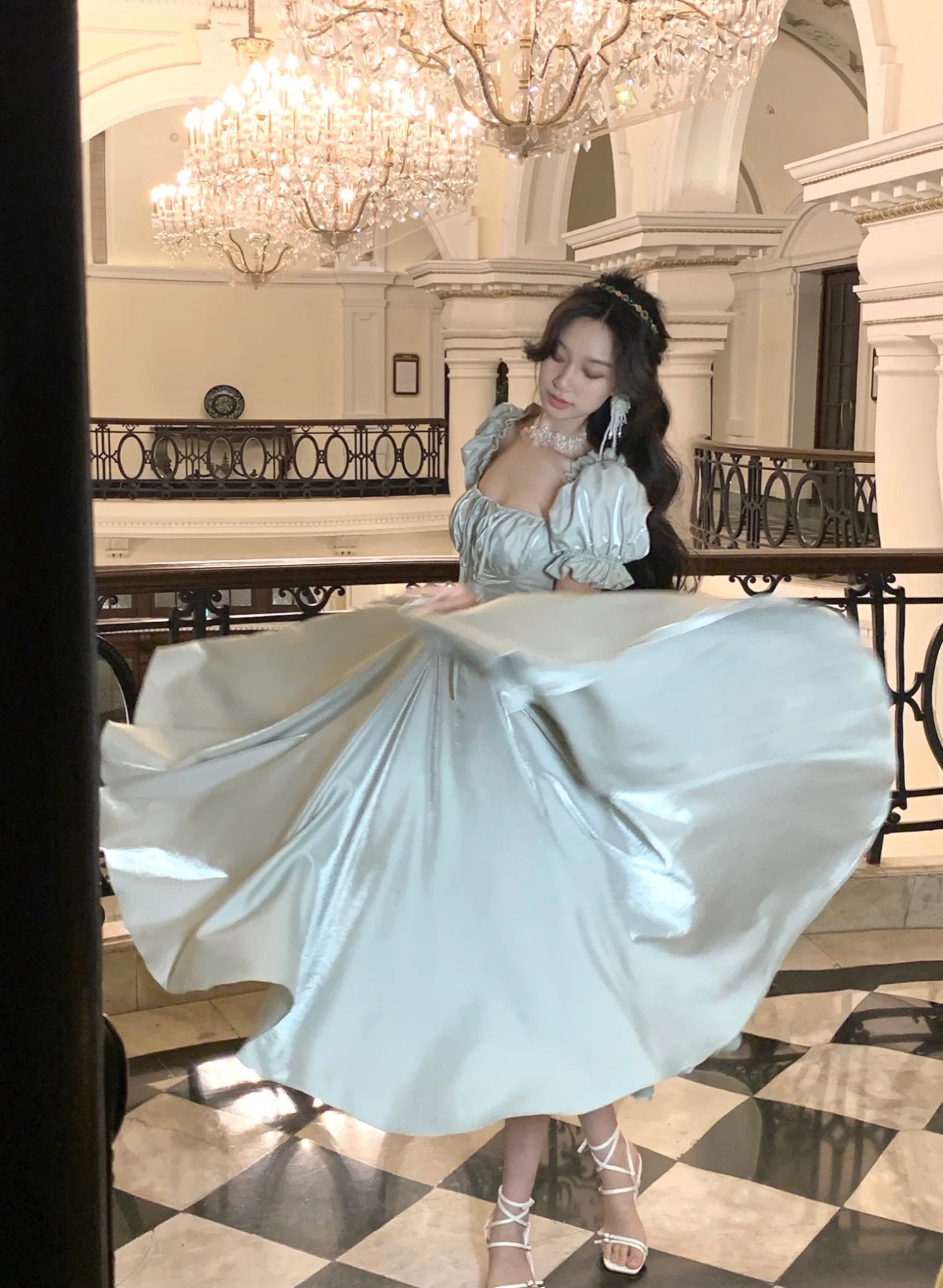 The short puff sleeves bring a playful and romantic vibe to the dress, adding volume and a touch of whimsy to the overall design.