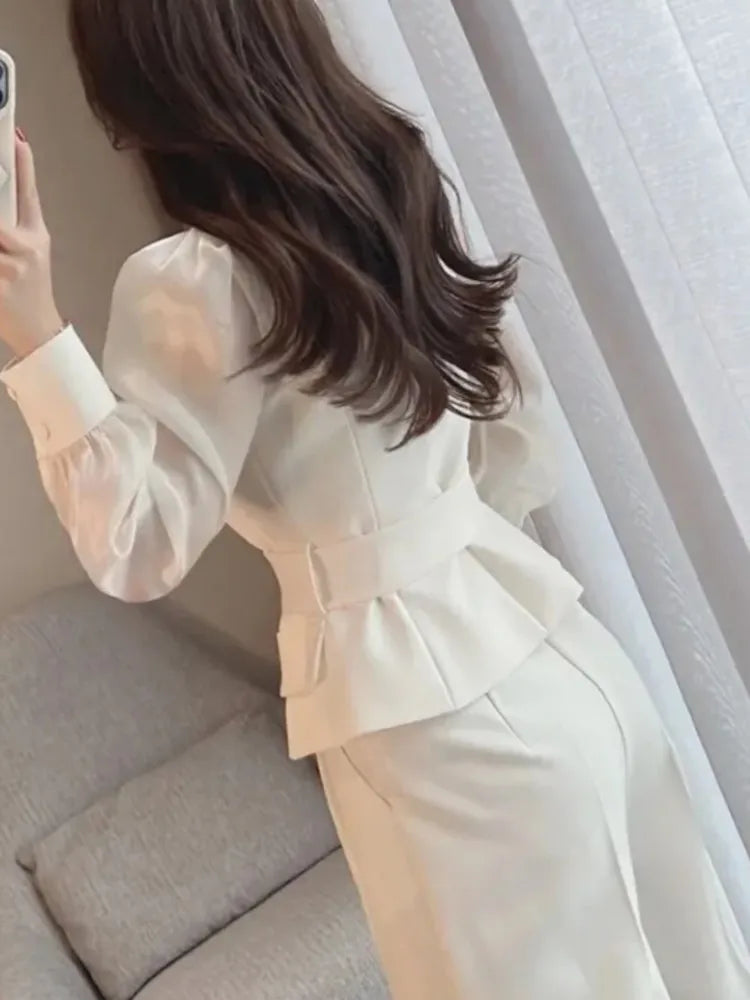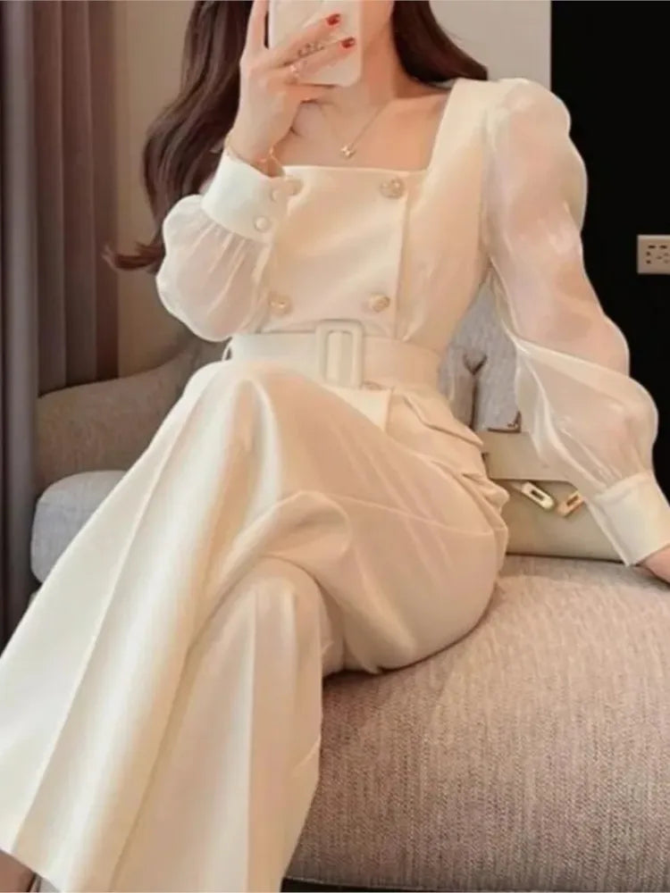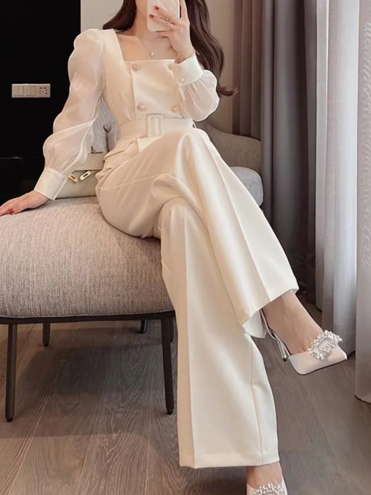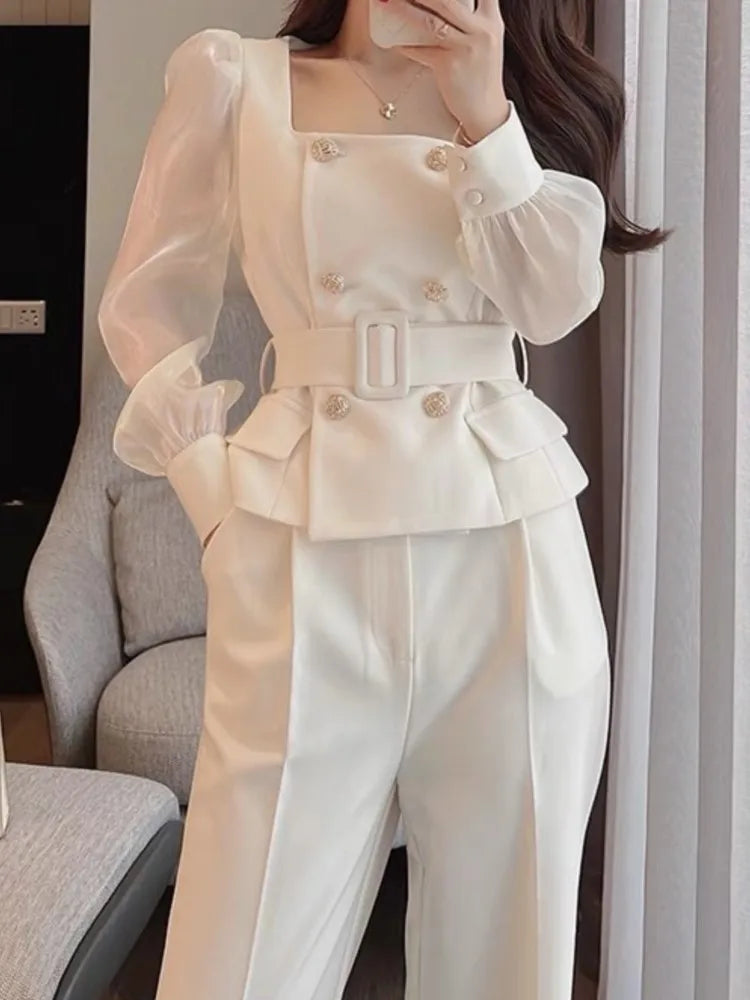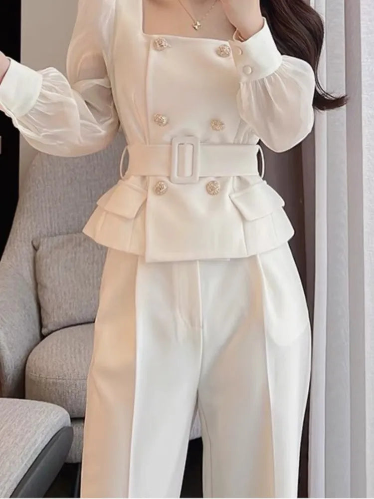 Square Neckline Top and Trousers Semi-Formal White Suit