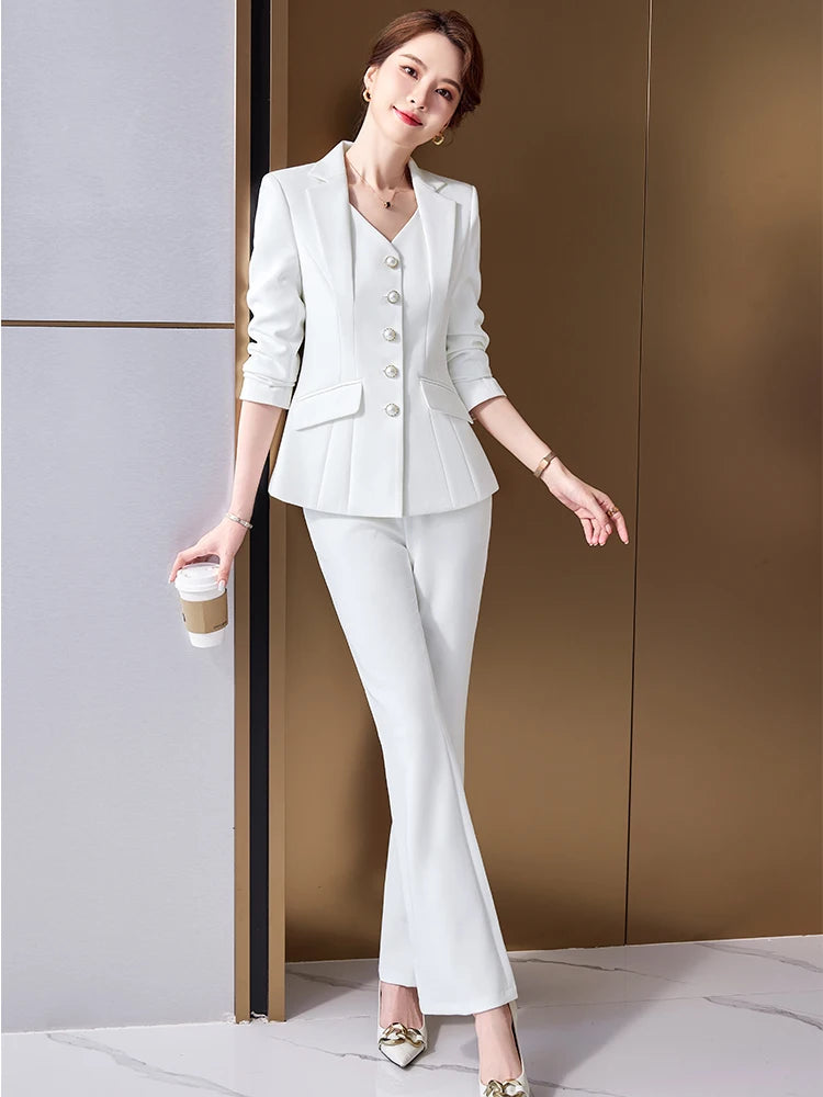 The blazer features a sharp straight cut design with a stylish touch of elegance, adorned with five eye-catching white buttons that add a refined finishing touch. Meanwhile, the straight-cut trousers offer a comfortable yet polished fit, ensuring you look and feel your best all day long.