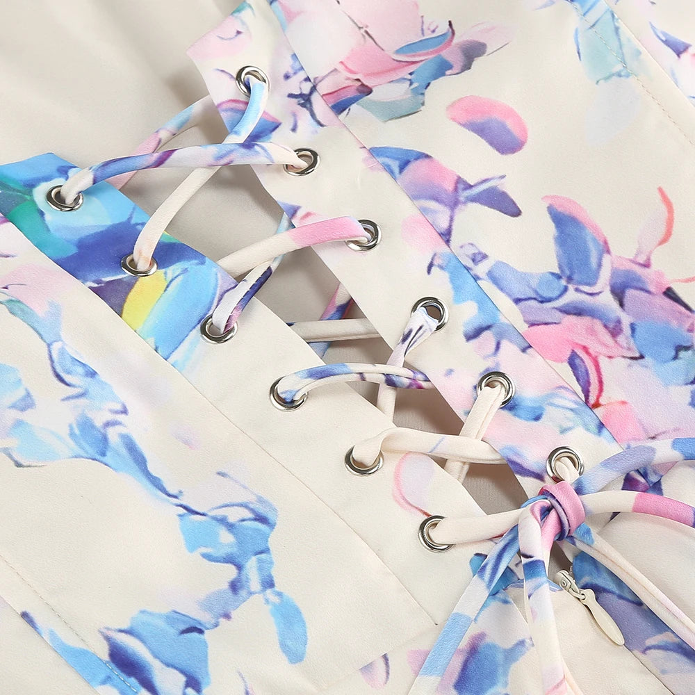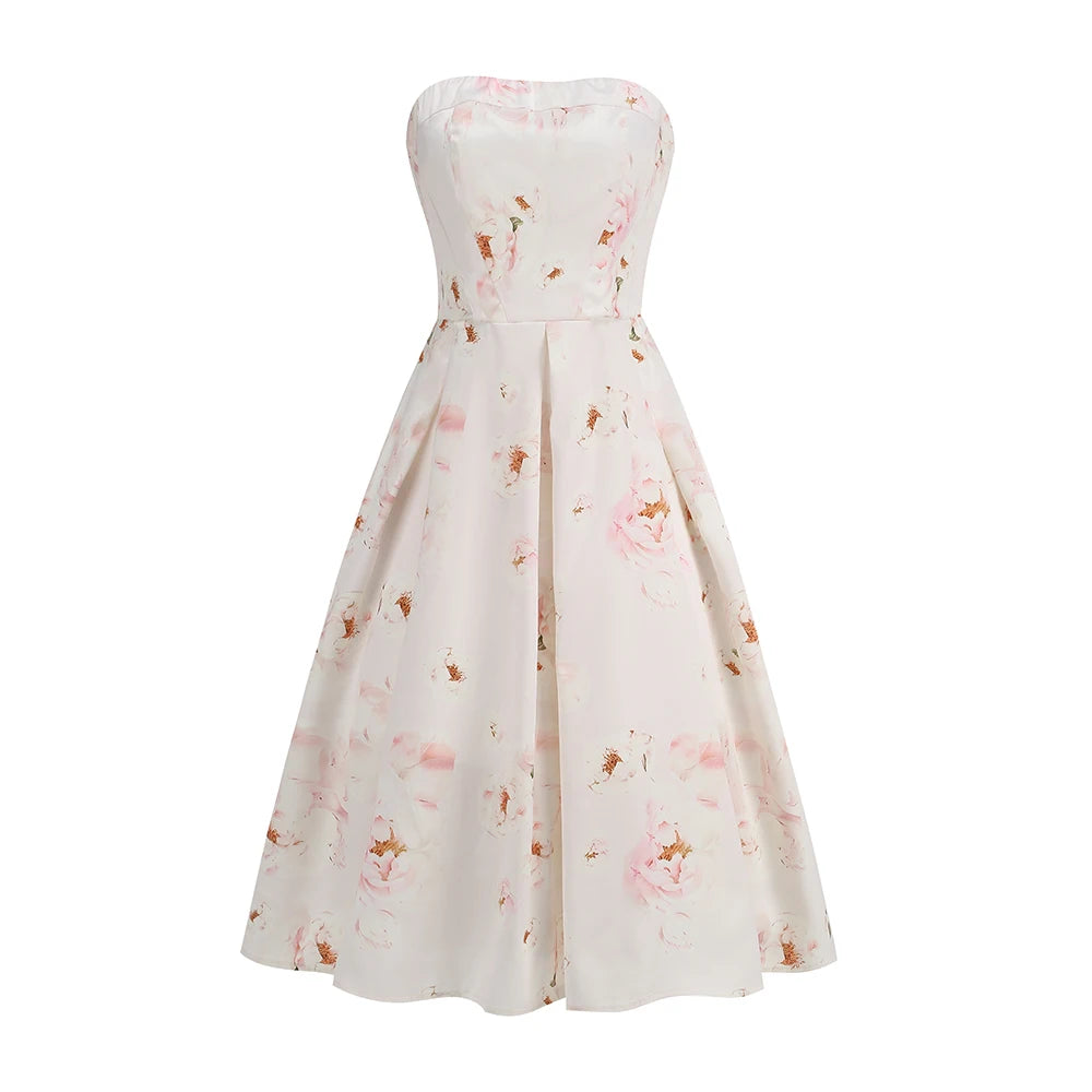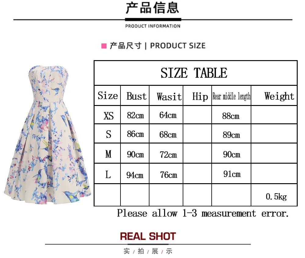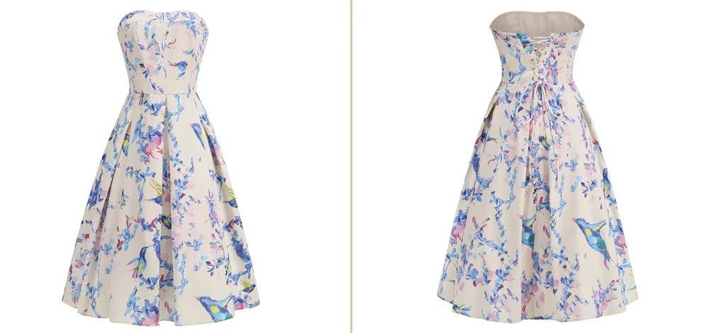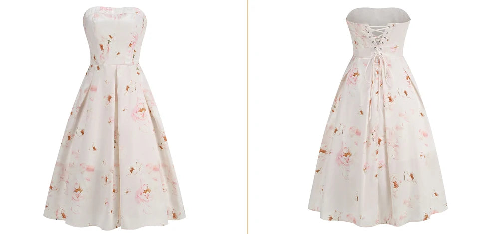 The strapless neckline adds a soft romantic touch, while the floral print brings life and color to every step. A back zipper paired with an adjustable tie-back rope ensures a secure yet comfortable fit. Made with non-stretch fabric for structure, it’s perfect for garden parties, brunches, or sunny getaways.