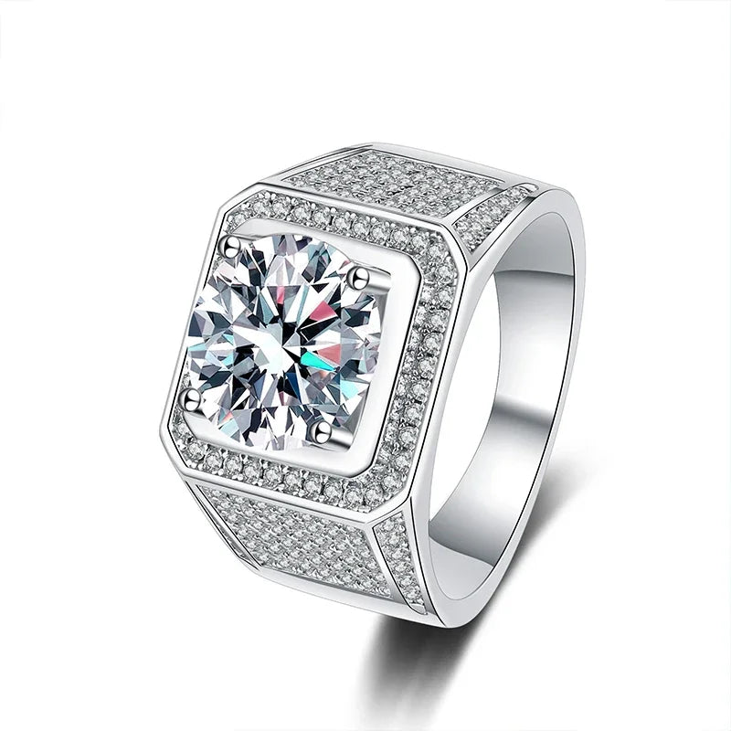 Elevate your style with the exquisite White Gold Plated 10-Carat Moissanite Men's Ring—a symbol of opulence and sophistication. This masterfully crafted ring showcases a breathtaking VVS1 Moissanite Diamond at its center, surrounded by an array of dazzling A5 zirconia stones that enhance its luxurious appeal.