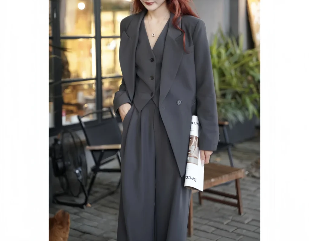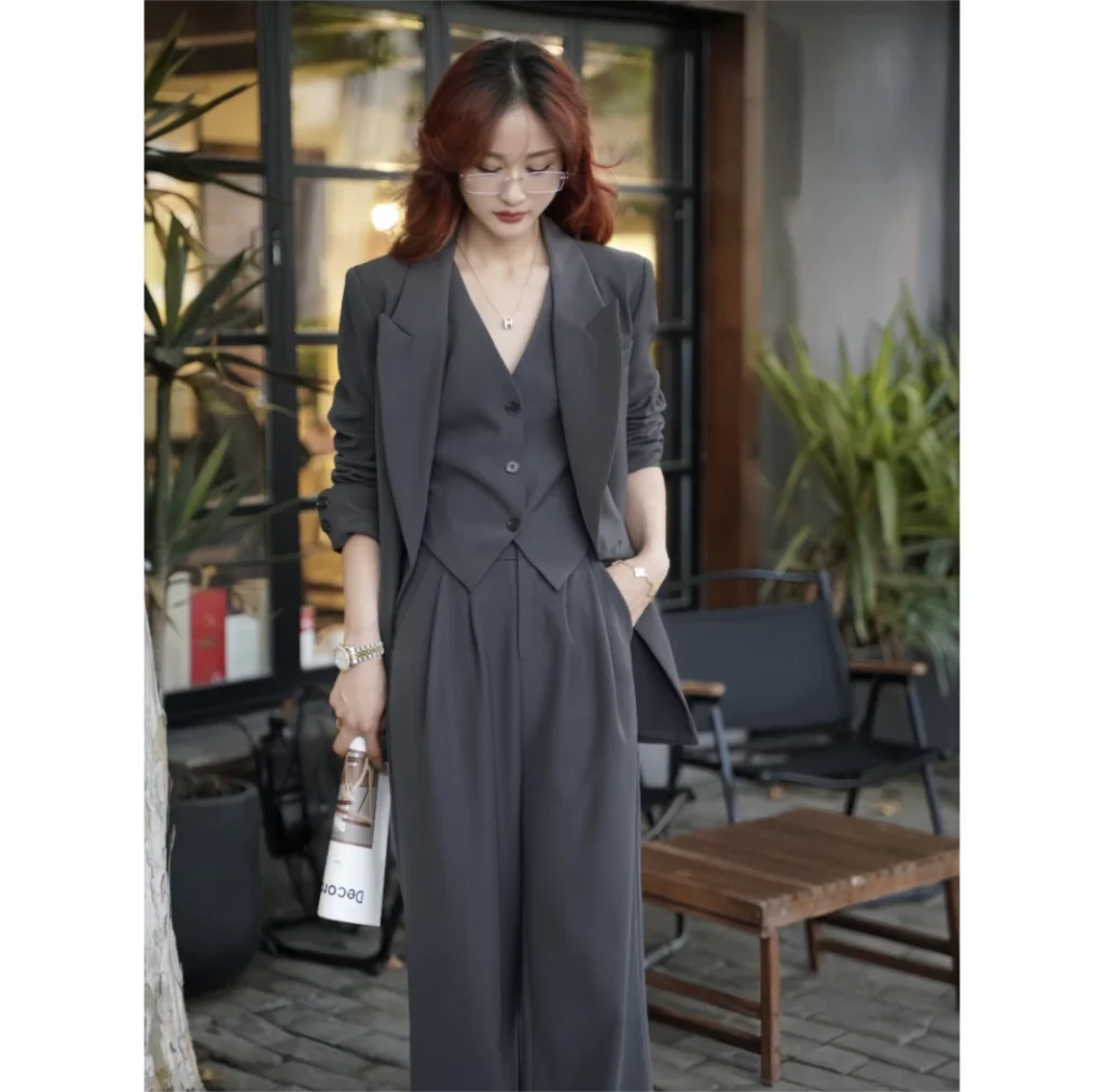 - Three-Piece Set: Includes a tailored blazer, a matching vest, and wide-leg trousers, offering versatility and ease in styling.